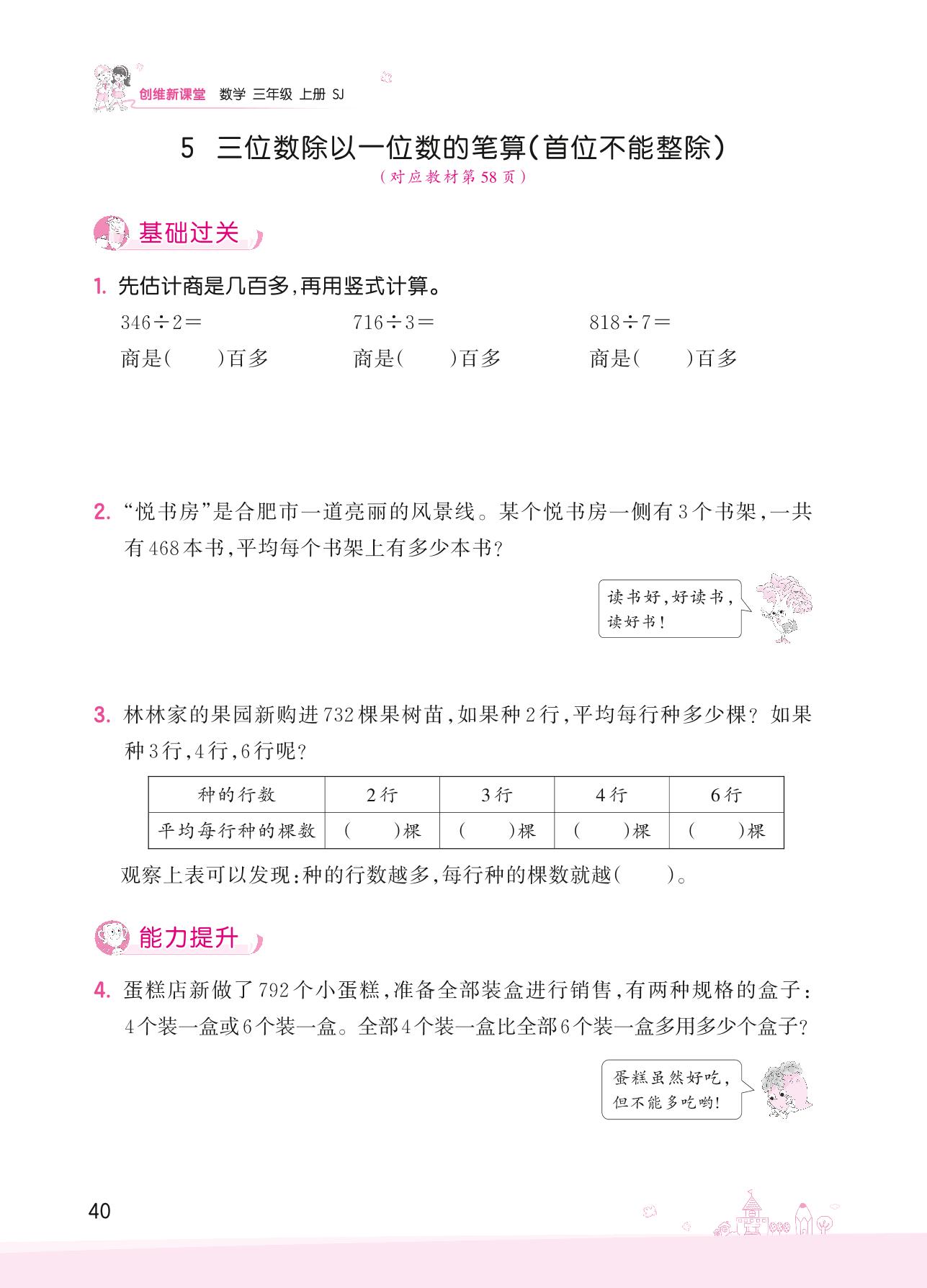 2022上册三年级数学苏教版 四 两、三位数除以一位数——5 三位数除以一位数的笔算(首位不能整除)