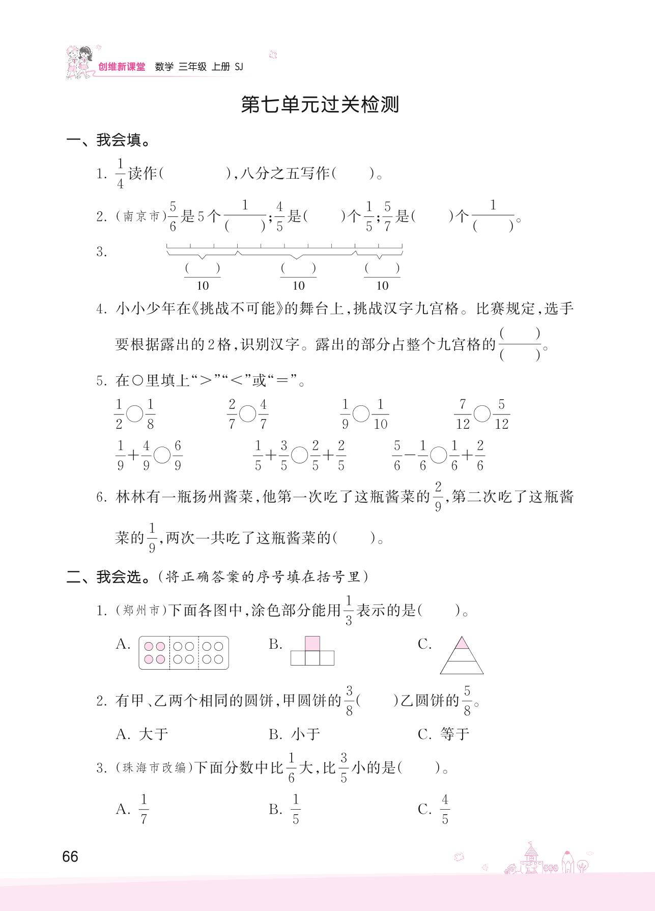 2022上册三年级数学苏教版 七 分数的初步认识(一)——第七单元过关检测