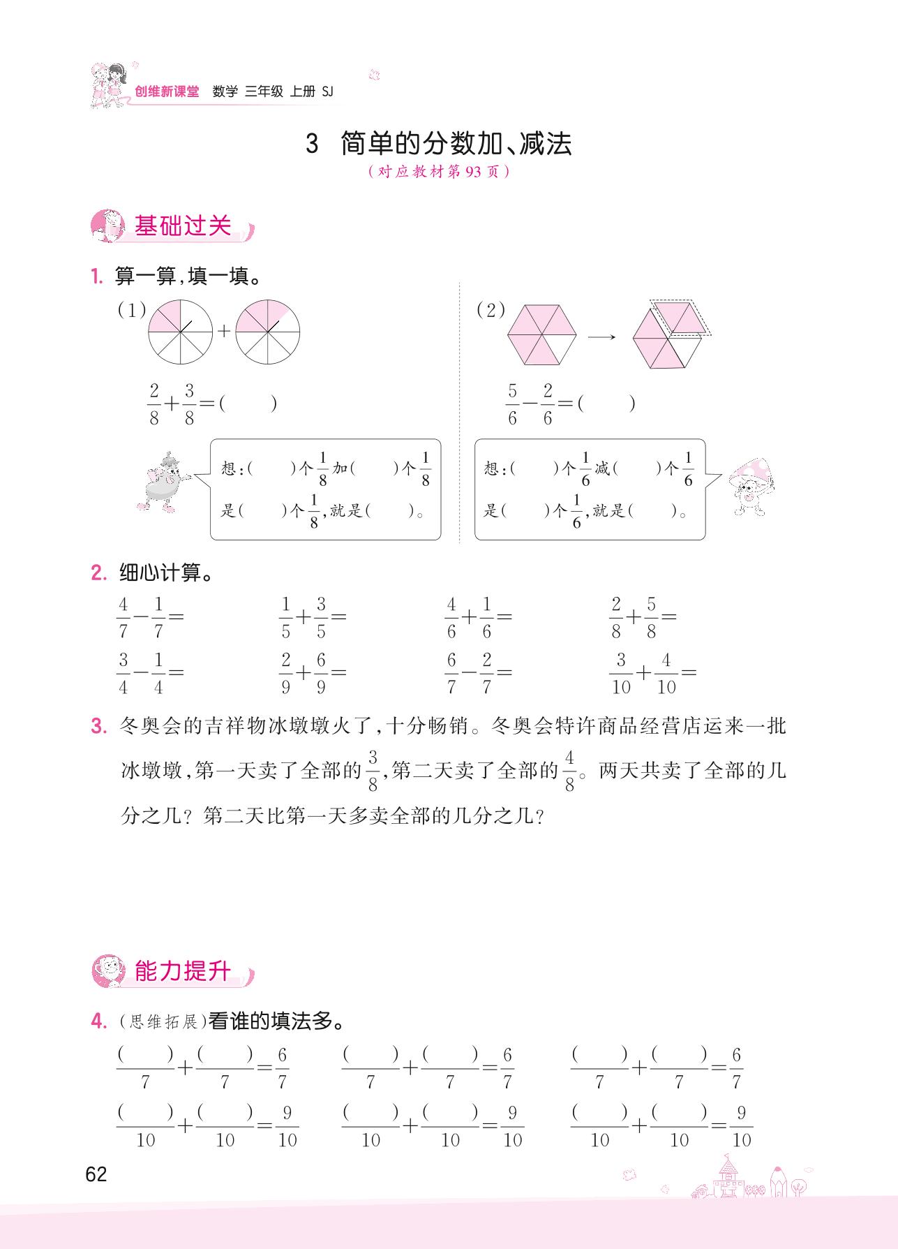 2022上册三年级数学苏教版 七 分数的初步认识(一)——3 简单的分数加、减法