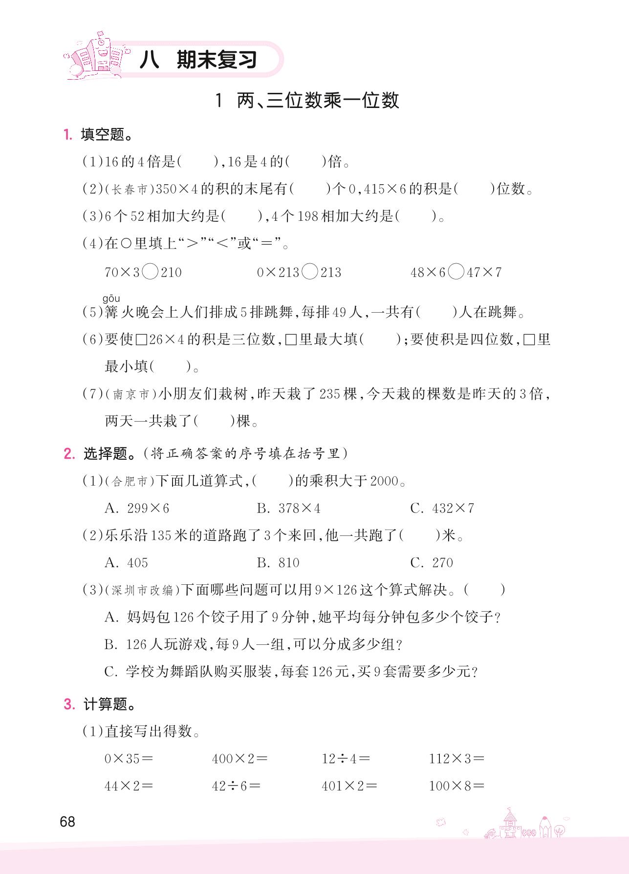 2022上册三年级数学苏教版 八 期末复习——1 两、三位数乘一位数