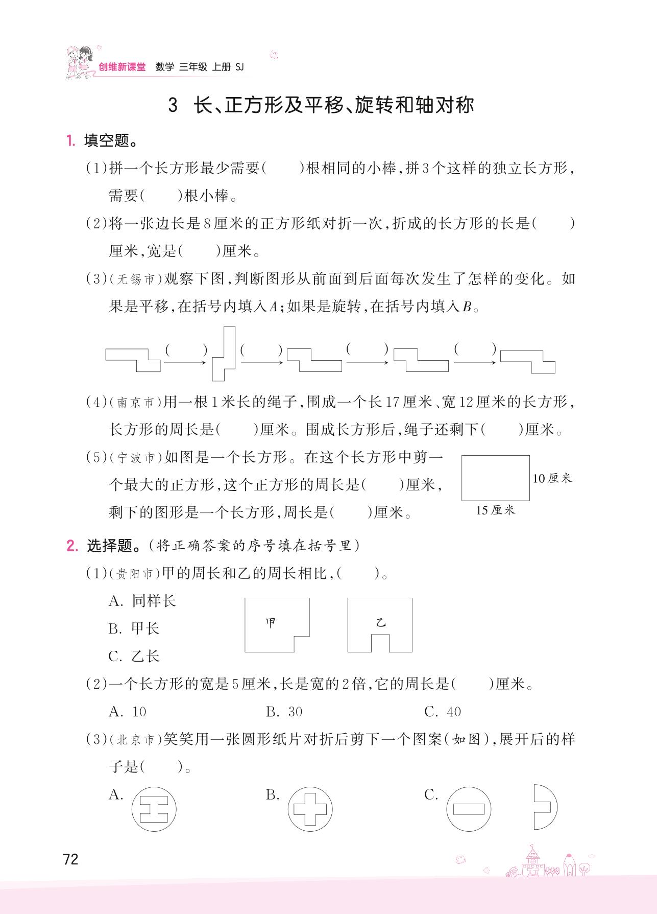 2022上册三年级数学苏教版 八 期末复习——3 长、正方形及平移、旋转和轴对称
