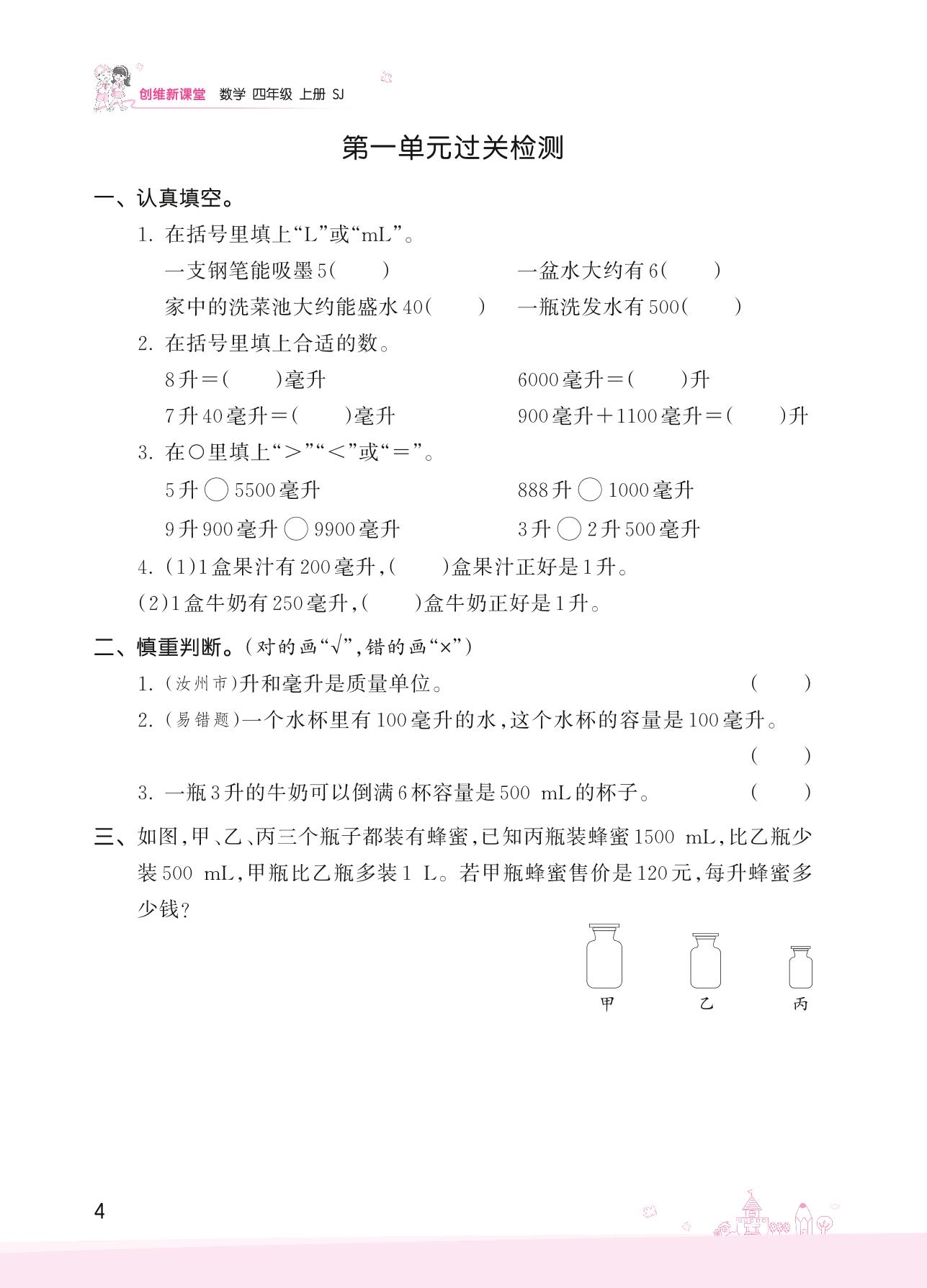 2022上册四年级数学苏教版 一 升和毫升——第一单元过关检测