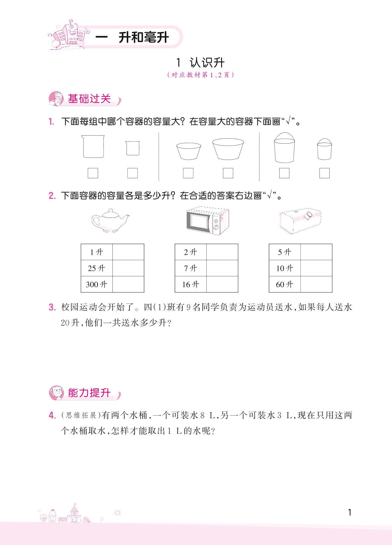 2022上册四年级数学苏教版 一 升和毫升——1 认识升