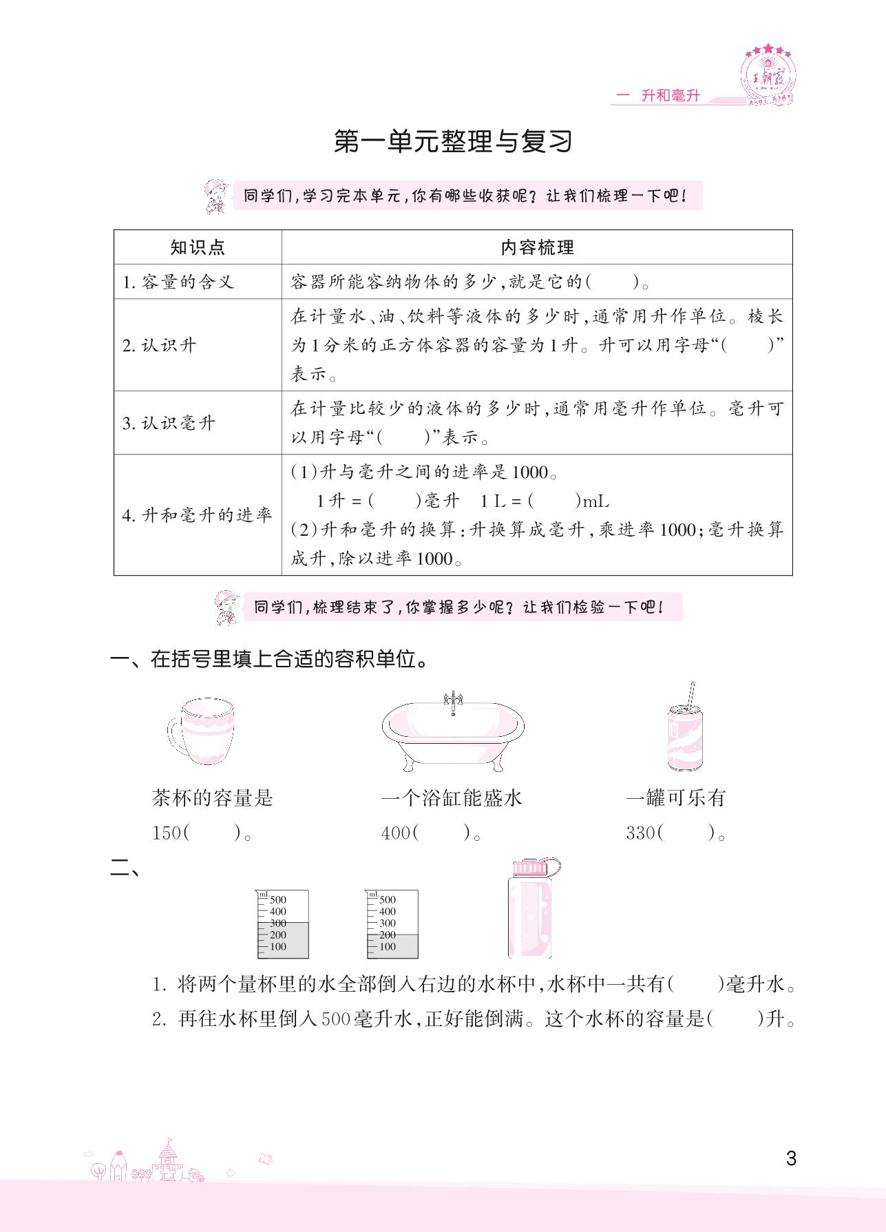 2022上册四年级数学苏教版 一 升和毫升——第一单元整理与复习