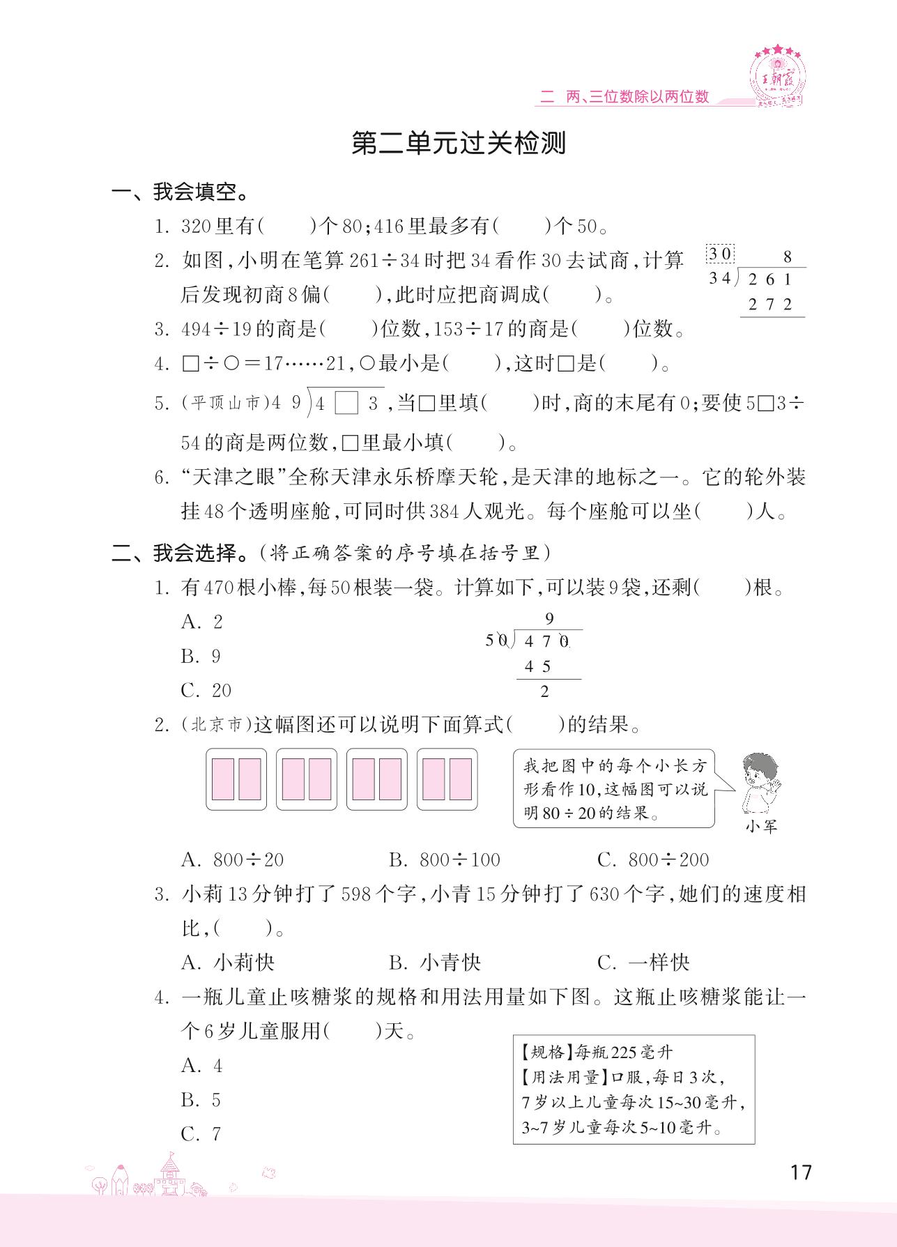 2022上册四年级数学苏教版 二 两、三位数除以两位数——第二单元过关检测
