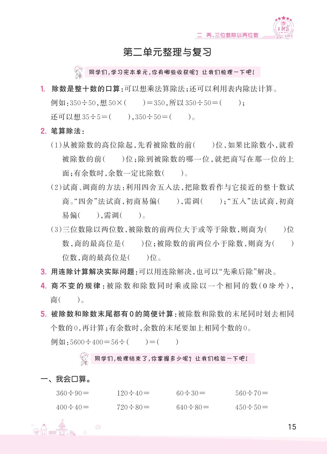 2022上册四年级数学苏教版 二 两、三位数除以两位数——第二单元整理与复习