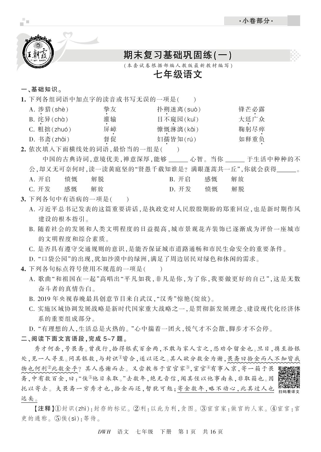 王朝霞期末小卷——期末复习基础巩固练七年级下册语文(人教版)_R21080243413【0】