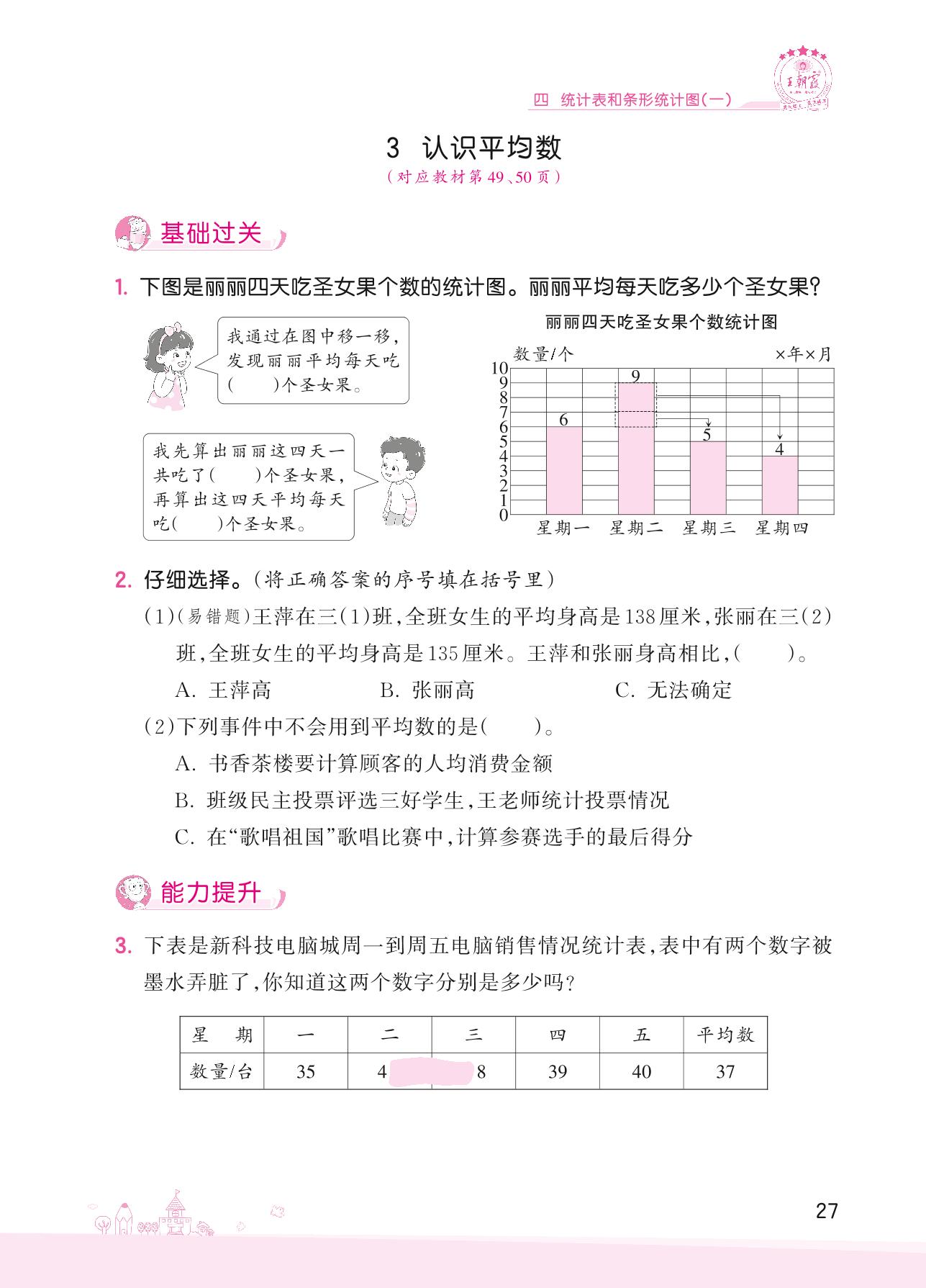 2022上册四年级数学苏教版 四 统计表和条形统计图(一)——3 认识平均数