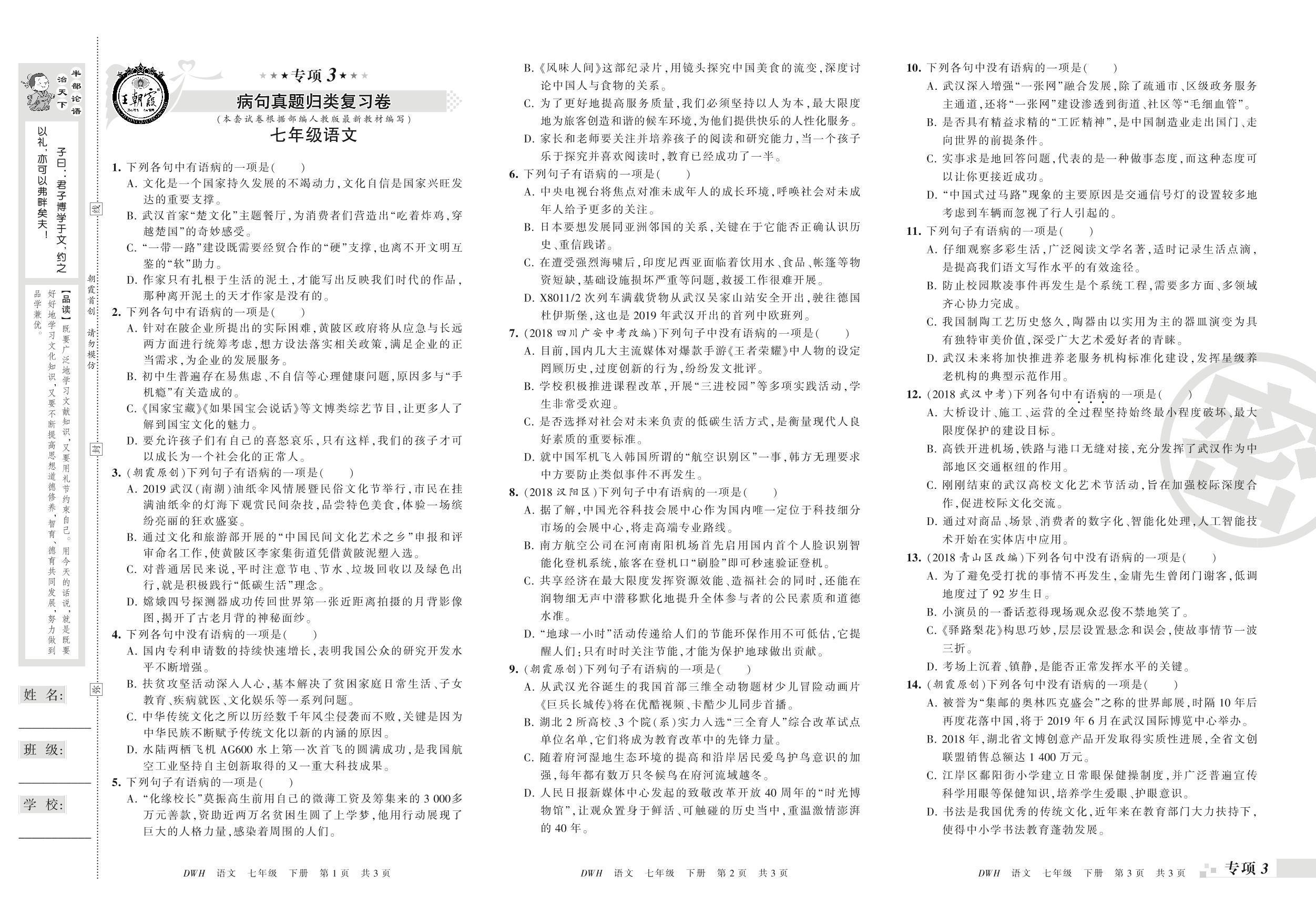 王朝霞期末专项卷——病句、语文知识与标点符号真题归类复习卷七年级下册语文(人教版)_R21080243431【0】