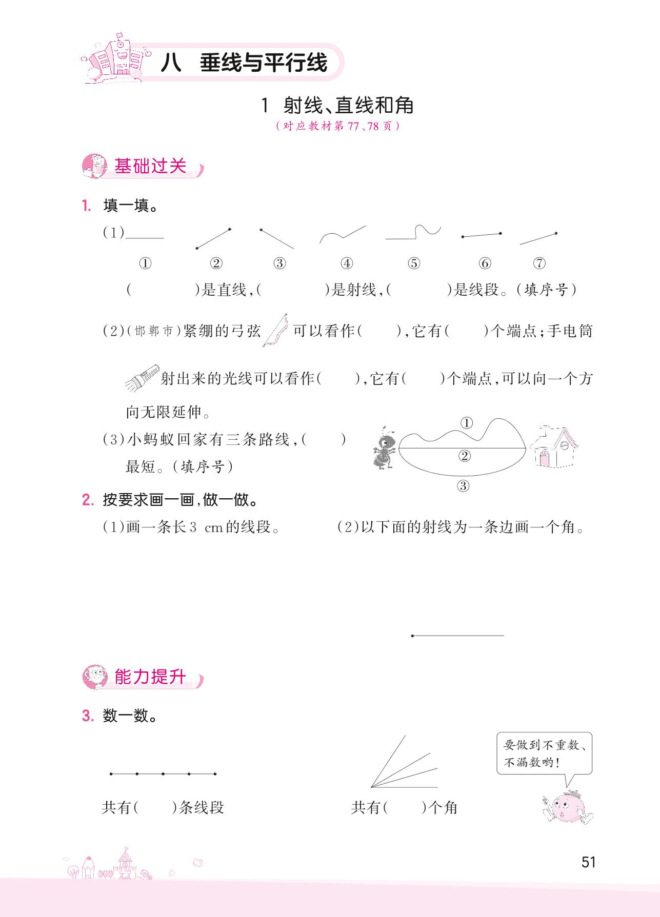 2022上册四年级数学苏教版 八 垂线与平行线——1 射线、直线和角