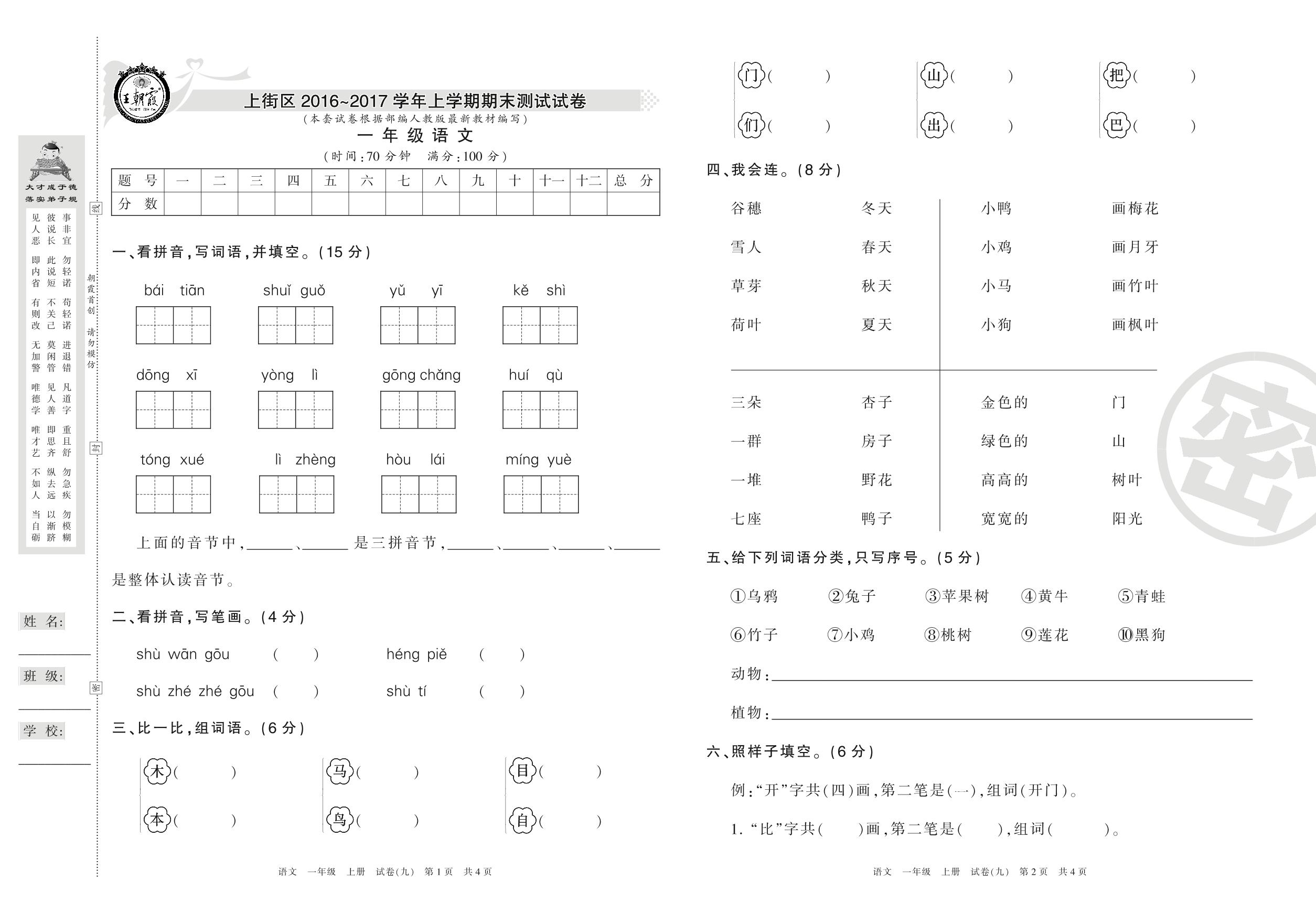2016-2017学年第一学期郑州市上街区一年级语文试卷(人教版)【9】