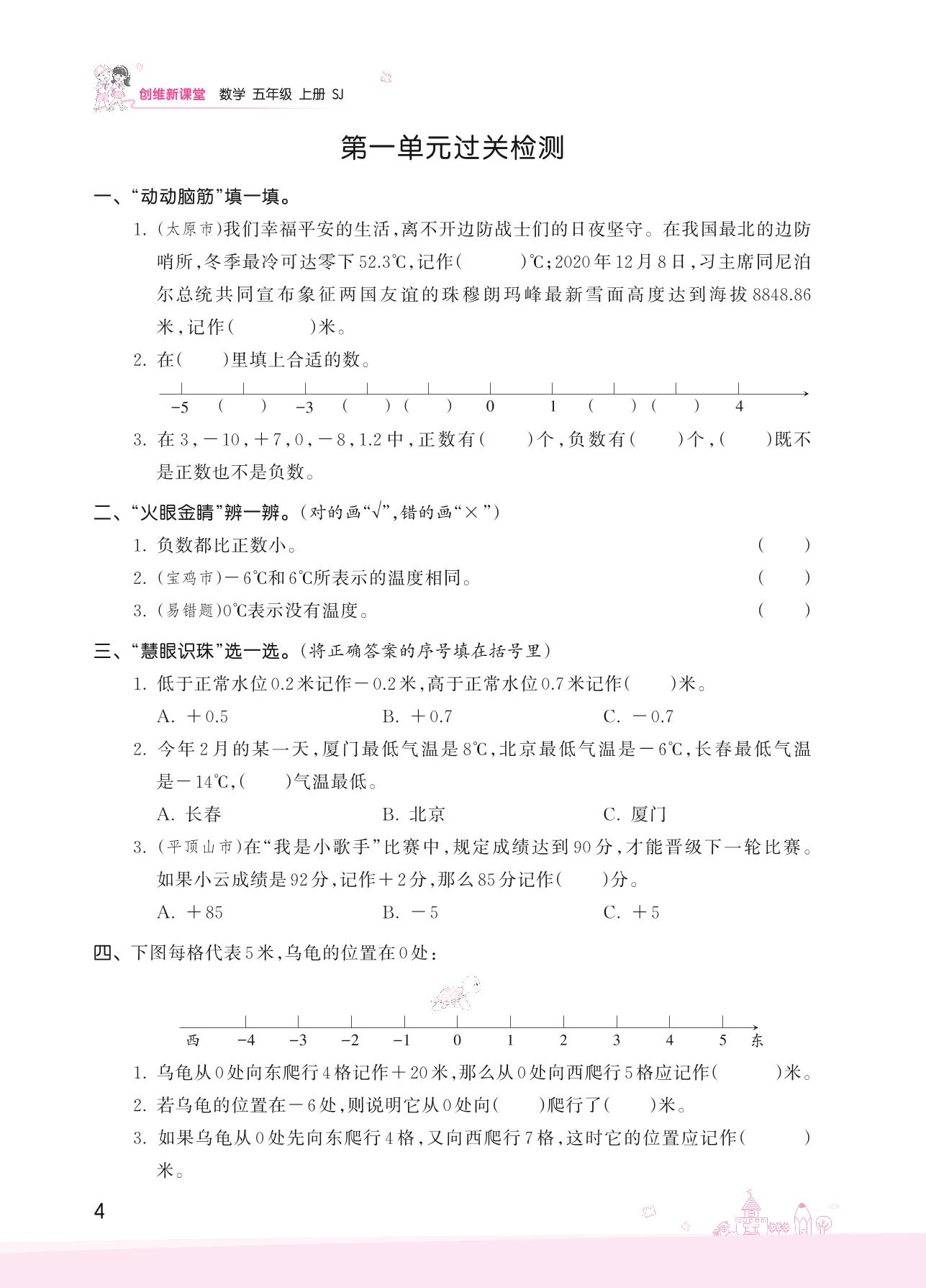 2022上册五年级数学苏教版 一 负数的初步认识——第一单元过关检测