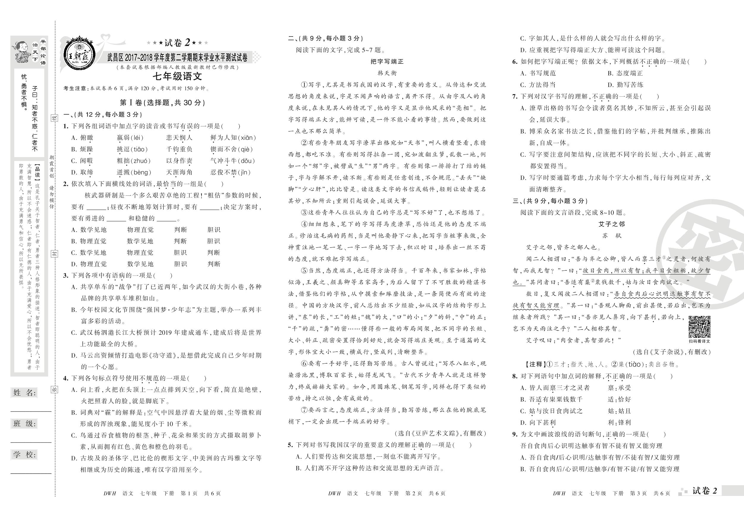 2017-2018学年第二学期武汉市武昌区七年级语文试卷(人教版)【2】