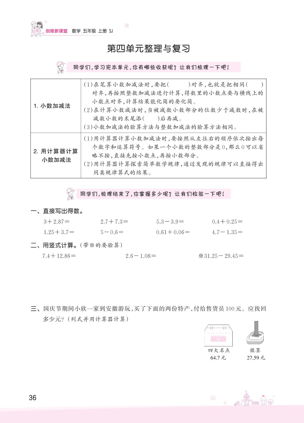2022上册五年级数学苏教版 四 小数加法和减法——第四单元整理与复习