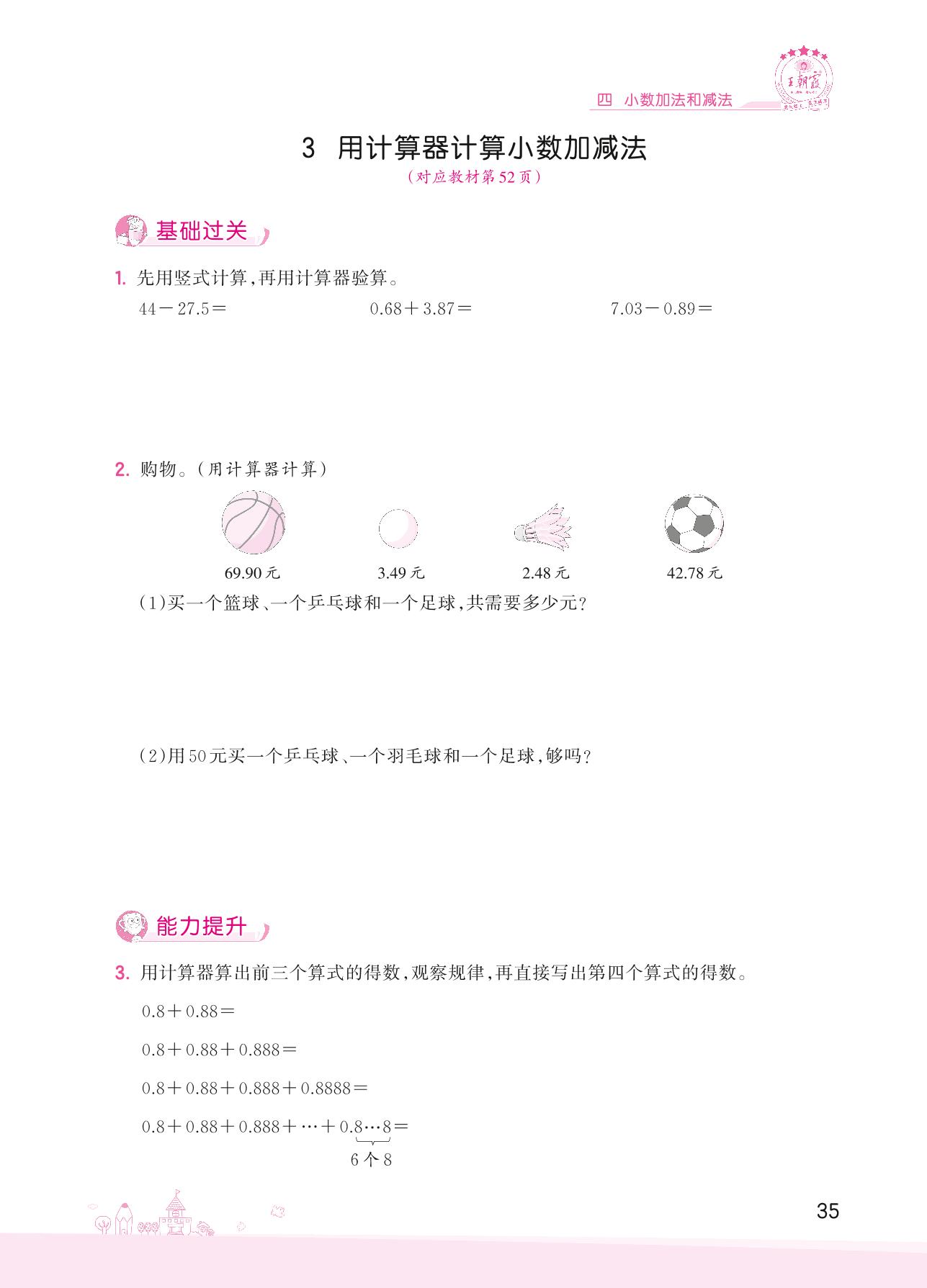 2022上册五年级数学苏教版 四 小数加法和减法——3 用计算器计算小数加减法