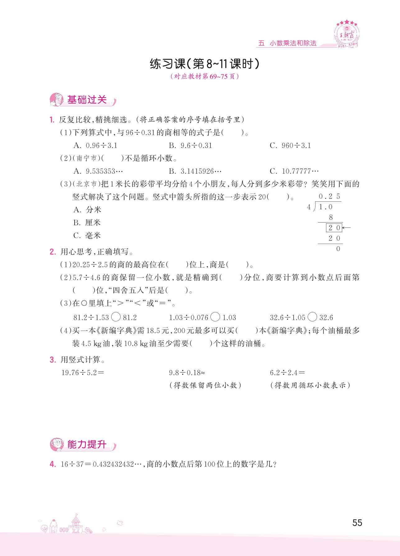 2022上册五年级数学苏教版 五 小数乘法和除法——练习课(第8~11课时)