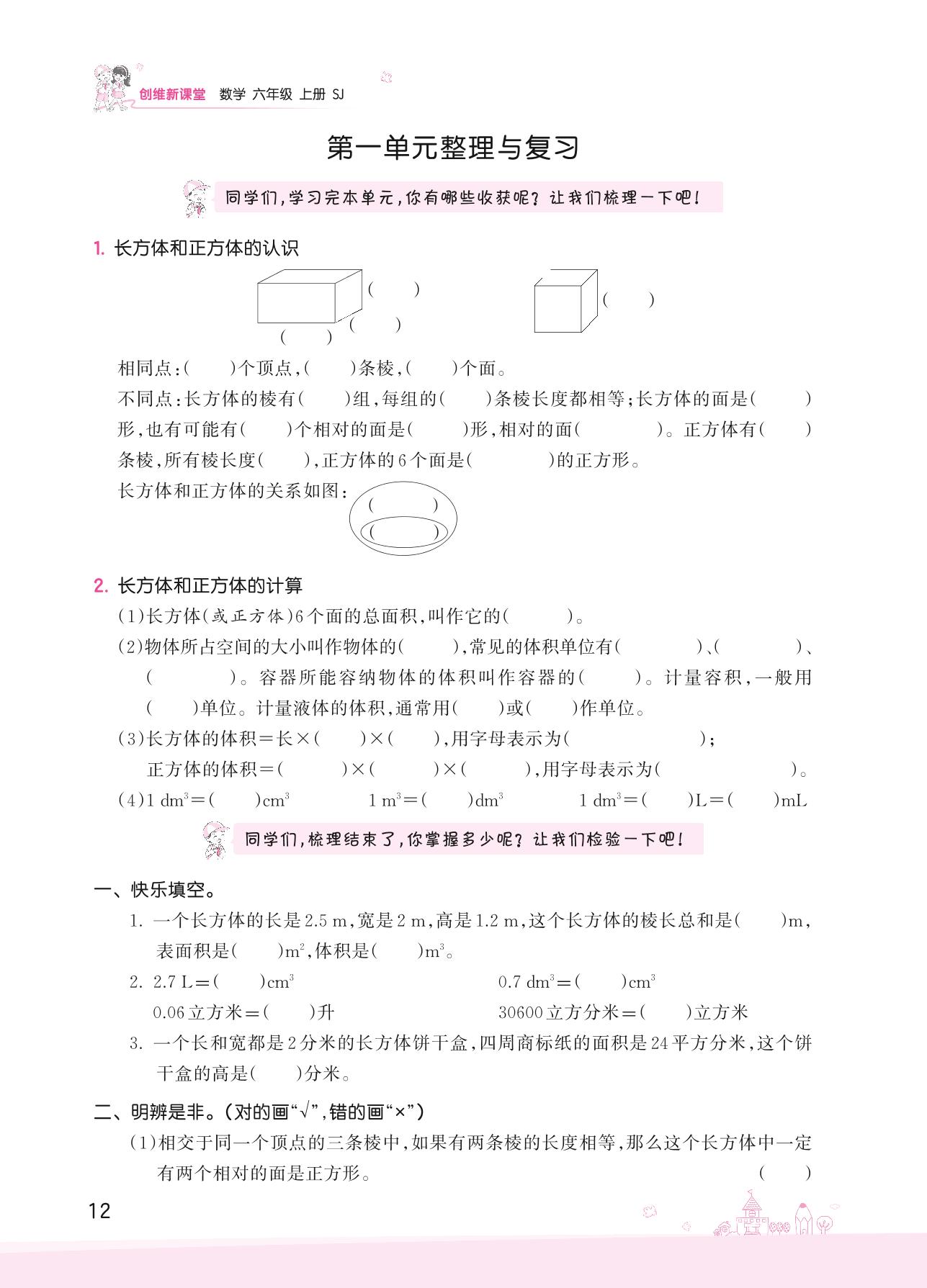2022上册六年级数学苏教版 一 长方体和正方体——第一单元整理与复习