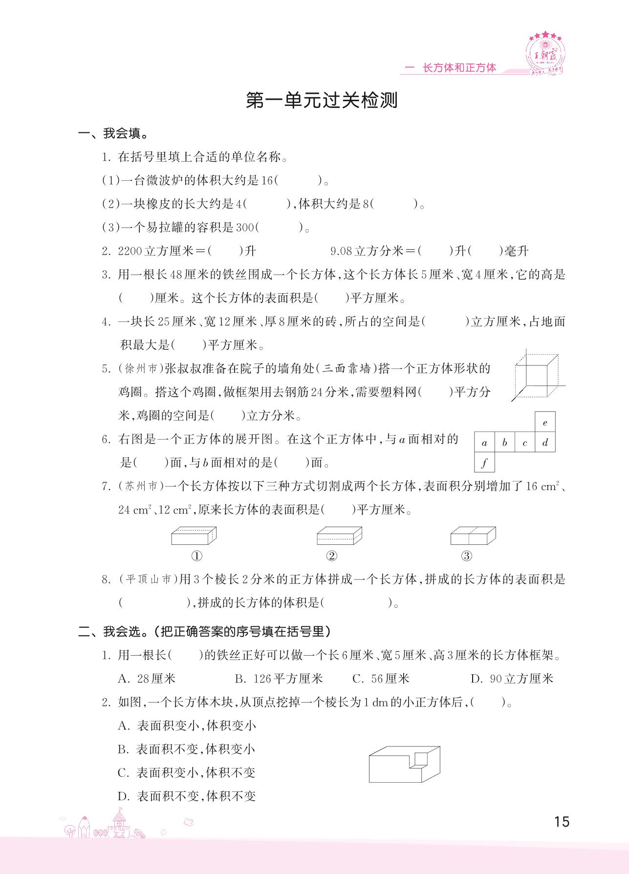 2022上册六年级数学苏教版 一 长方体和正方体——第一单元过关检测