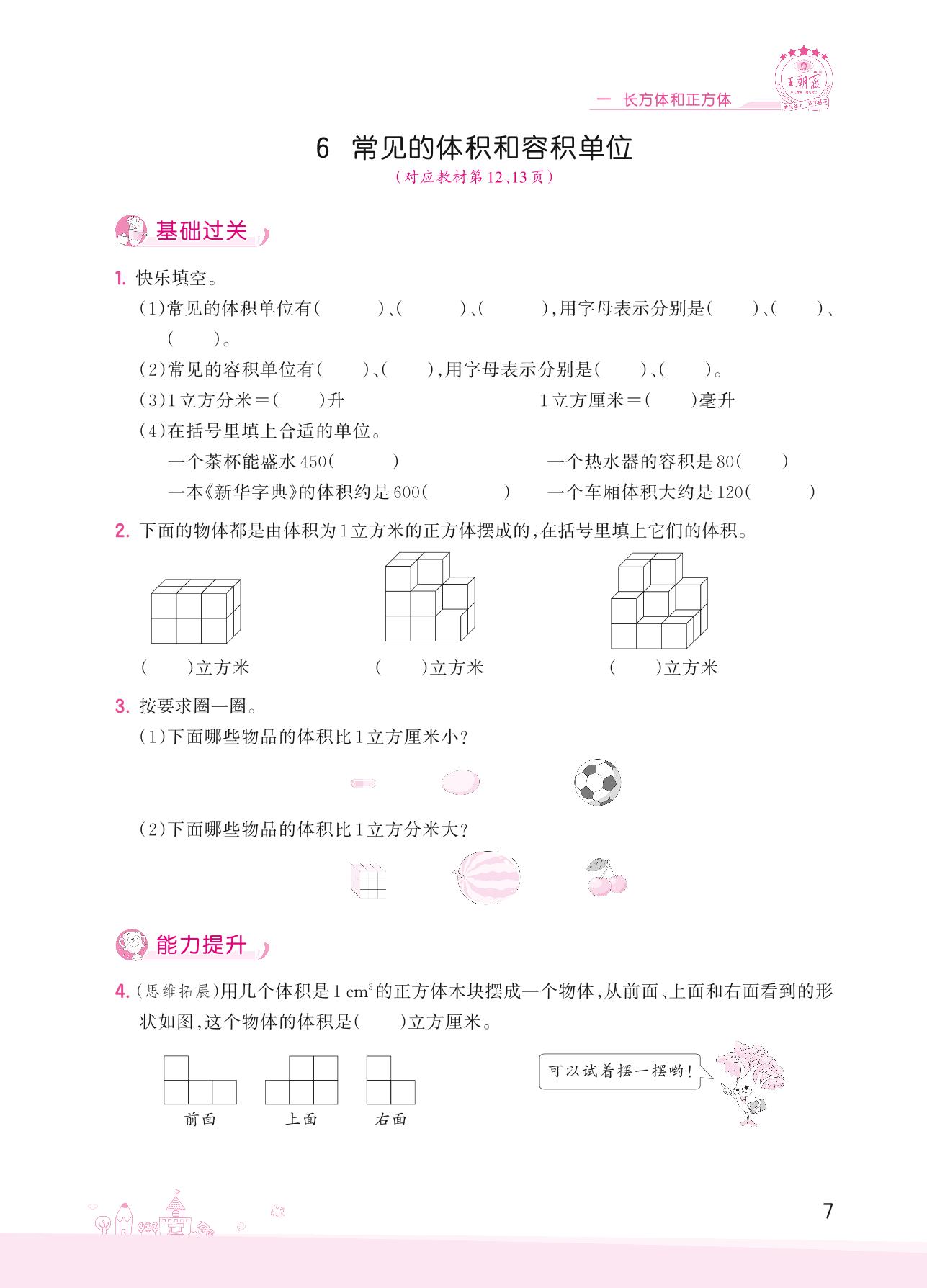 2022上册六年级数学苏教版 一 长方体和正方体——6 常见的体积和容积单位