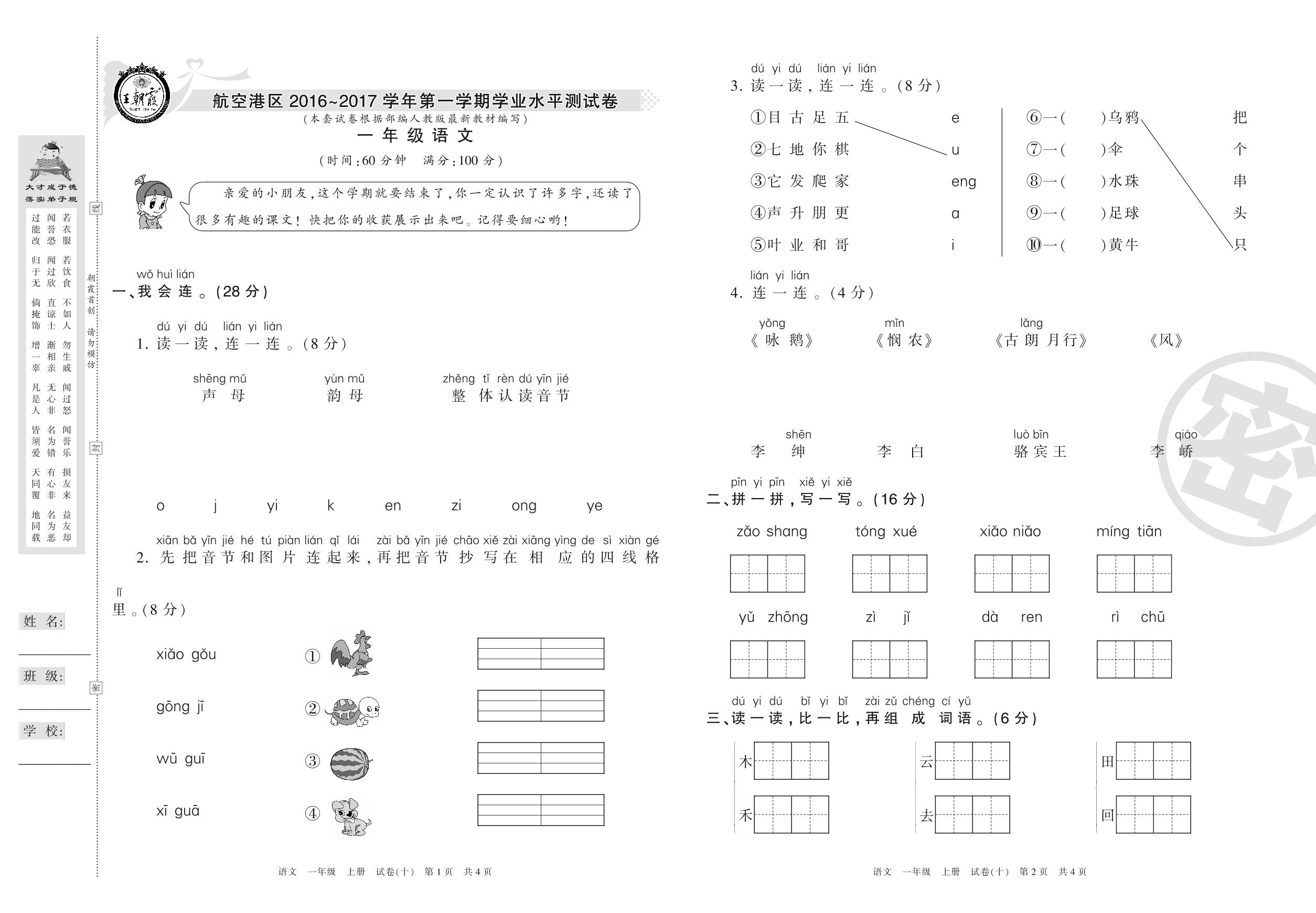2016-2017学年第一学期郑州市航空港区一年级语文试卷(人教版)【10】