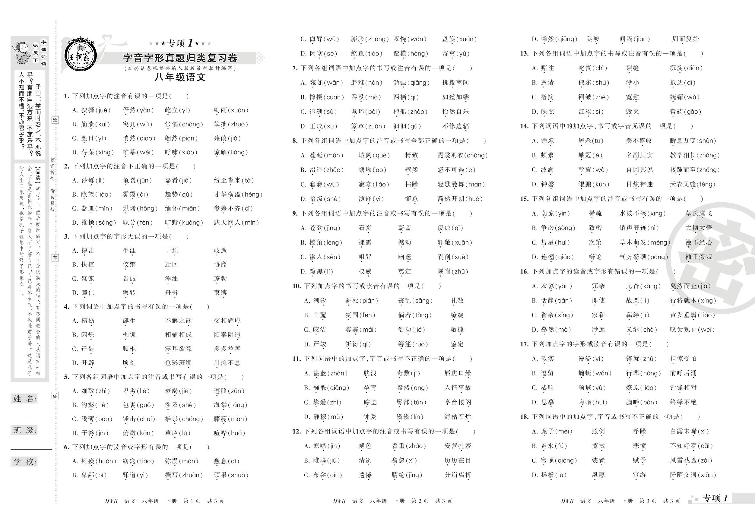 王朝霞期末专项卷——字音字形、词语理解与运用真题归类复习卷八年级下册语文(人教版)_R21080243610【0】