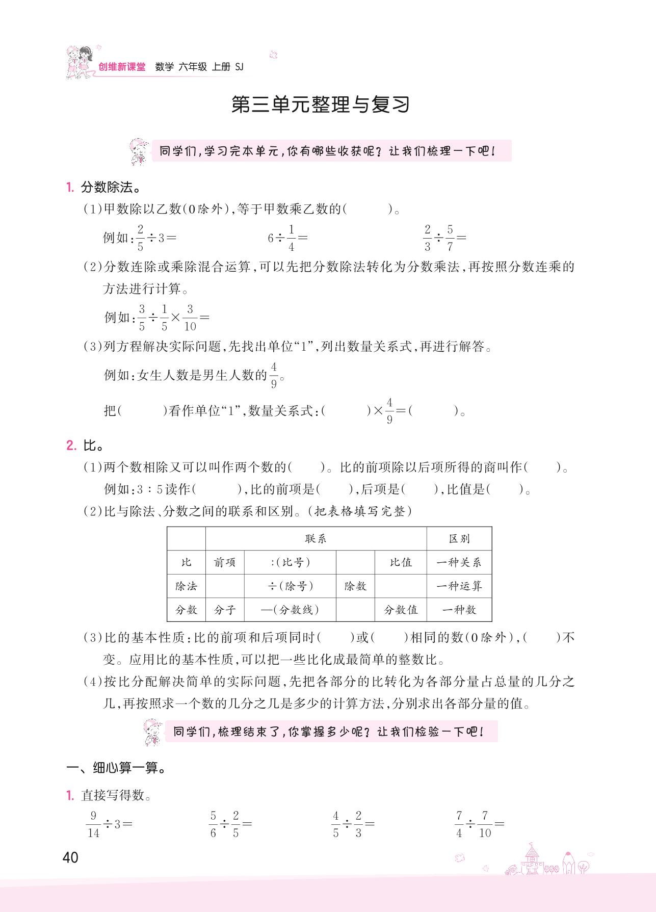 2022上册六年级数学苏教版 三 分数除法——第三单元整理与复习