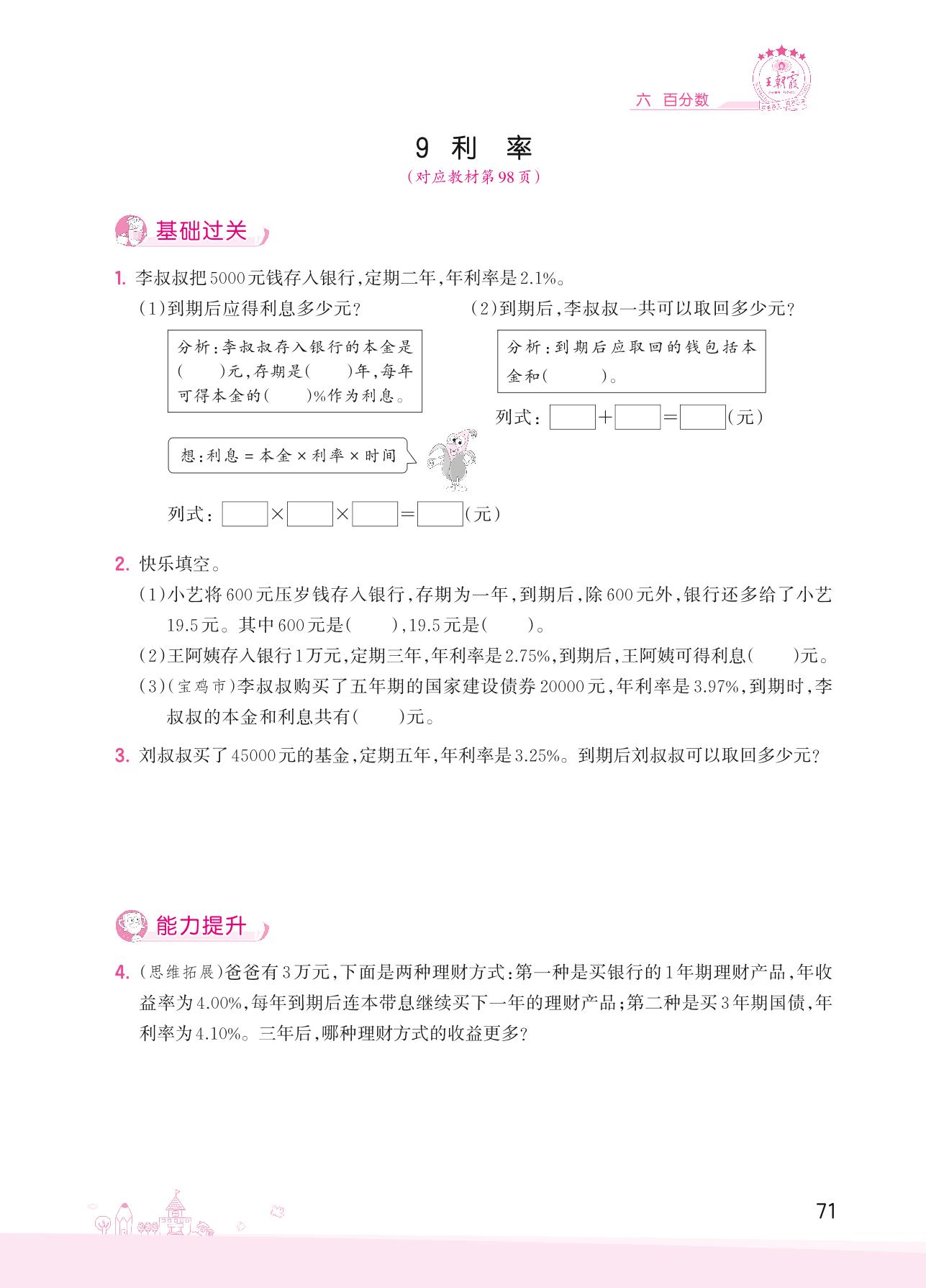 2022上册六年级数学苏教版 六 百分数——9 利率