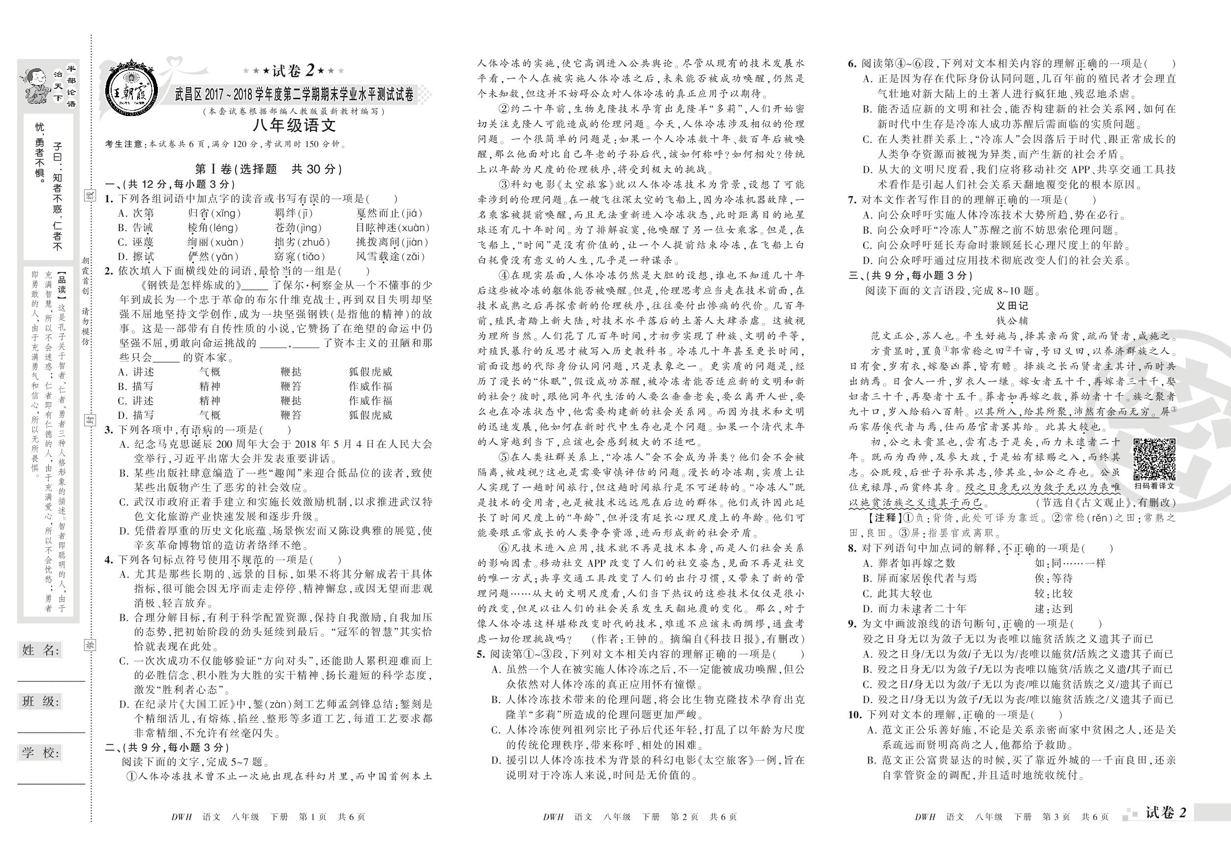 2017-2018学年第二学期武汉市武昌区八年级语文试卷(人教版)【2】