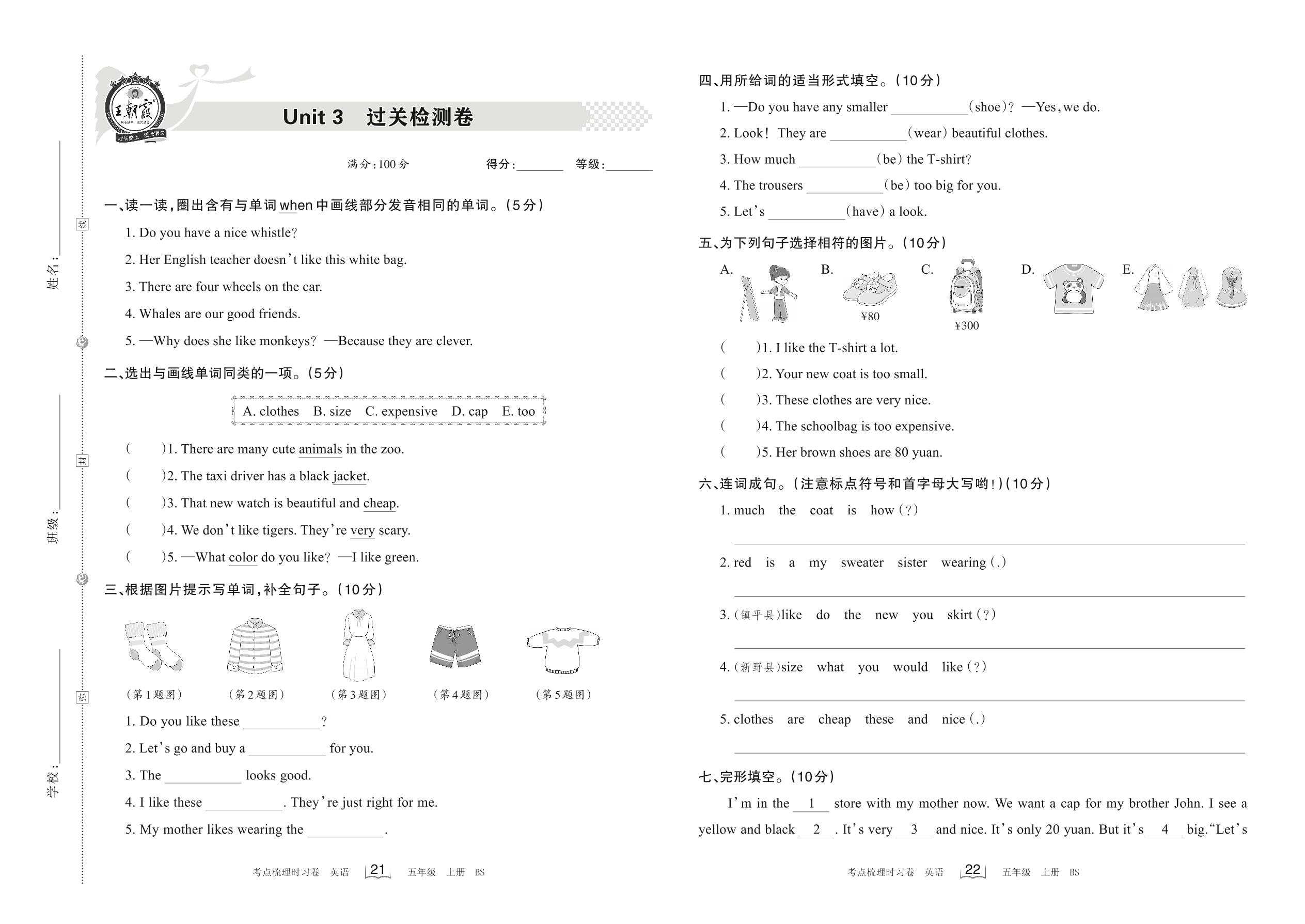 2022上册五年级英语北师版 Unit 3 过关检测卷