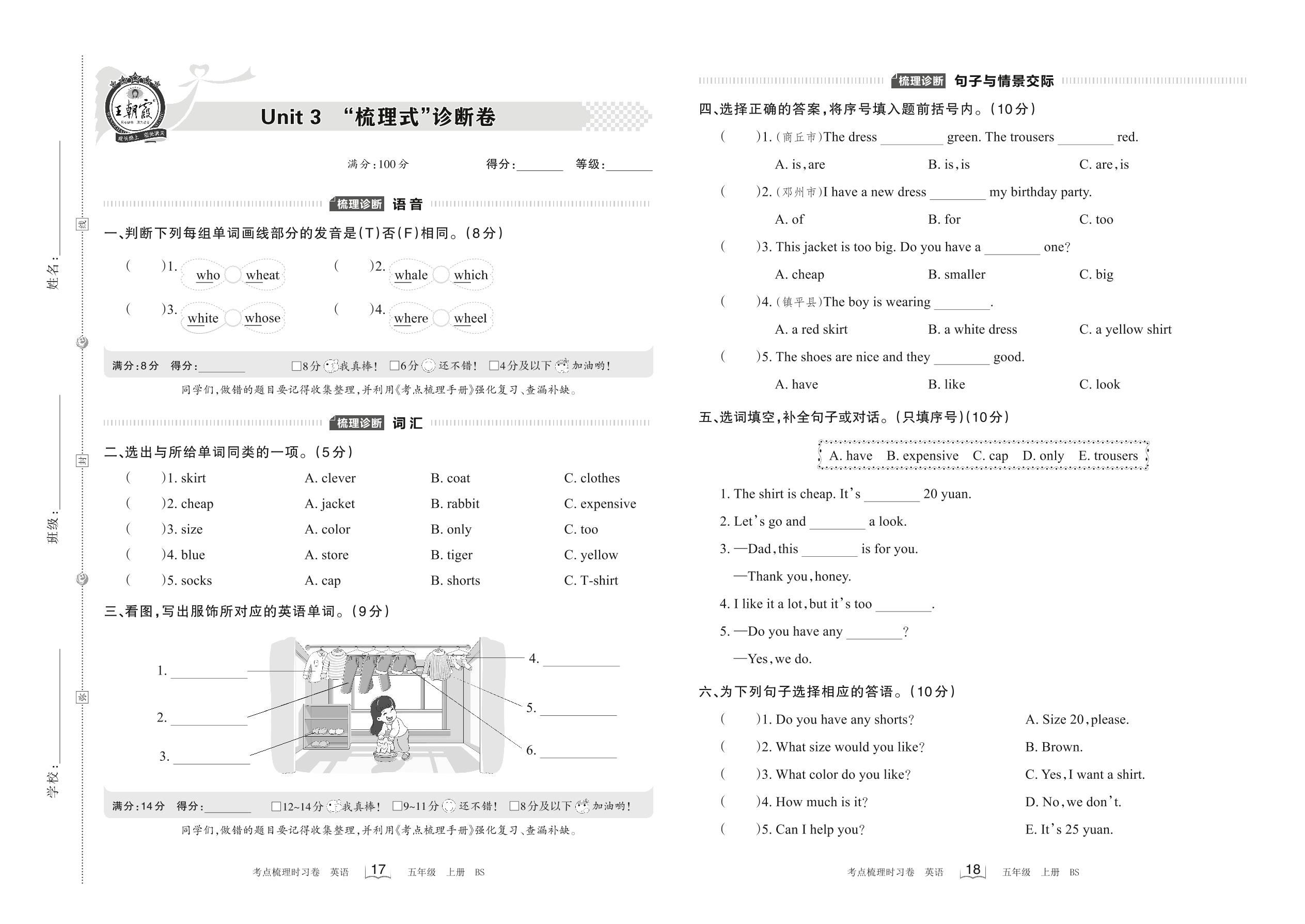 2022上册五年级英语北师版 Unit 3 “梳理式”诊断卷