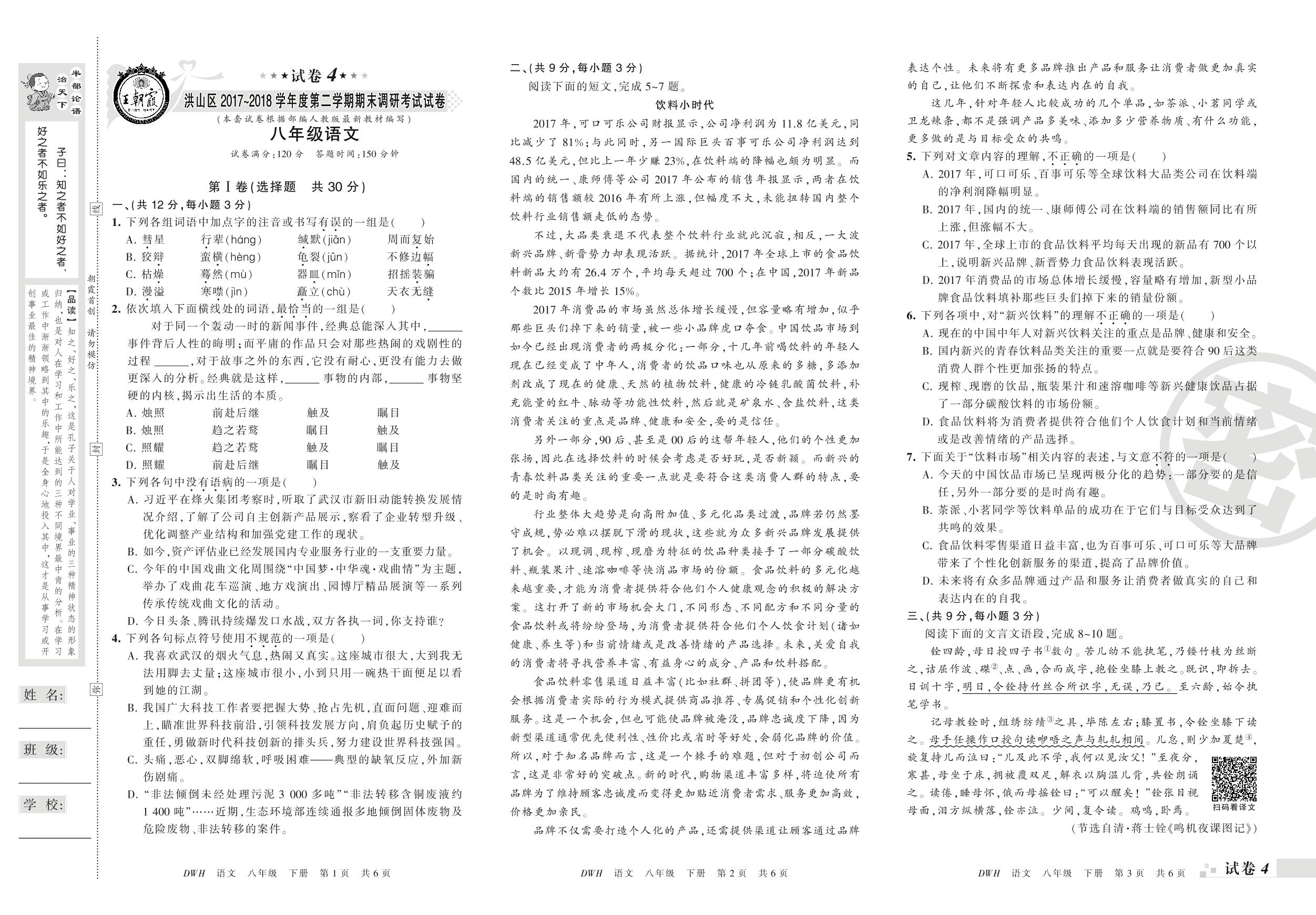 2017-2018学年第二学期武汉市洪山区八年级语文试卷(人教版)【4】