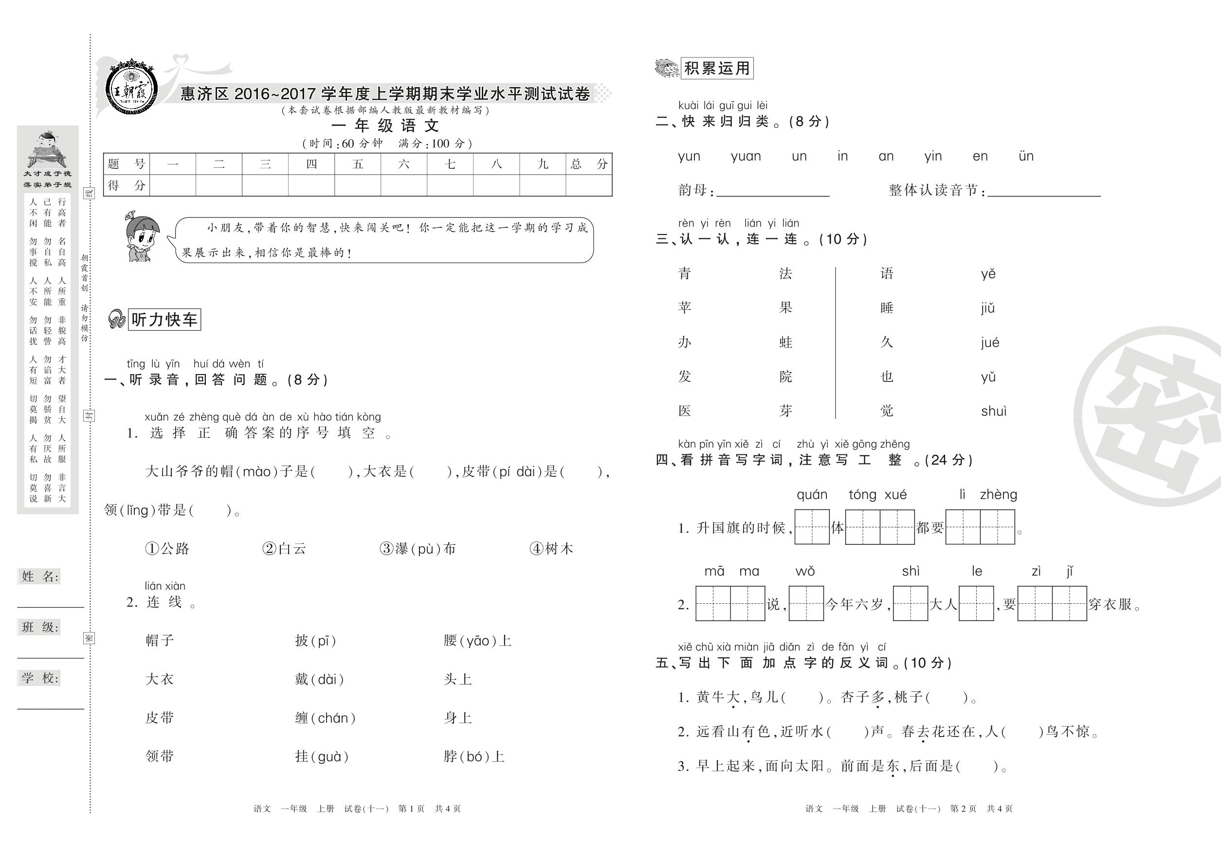 2016-2017学年第一学期郑州市惠济区一年级语文试卷(人教版)【11】