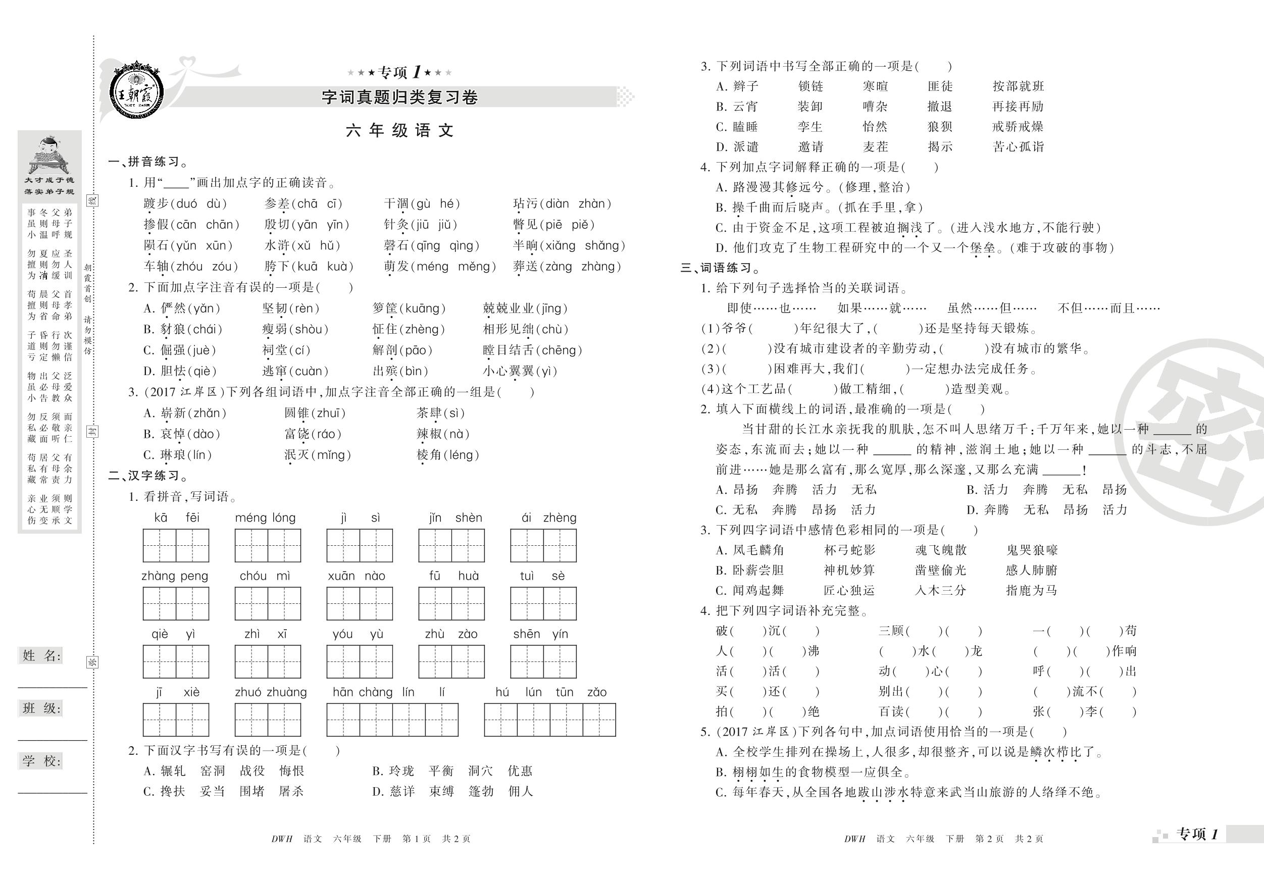 王朝霞期末专项卷——字词、句子真题归类复习卷六年级下册语文(鄂教版)_R21080243757【0】