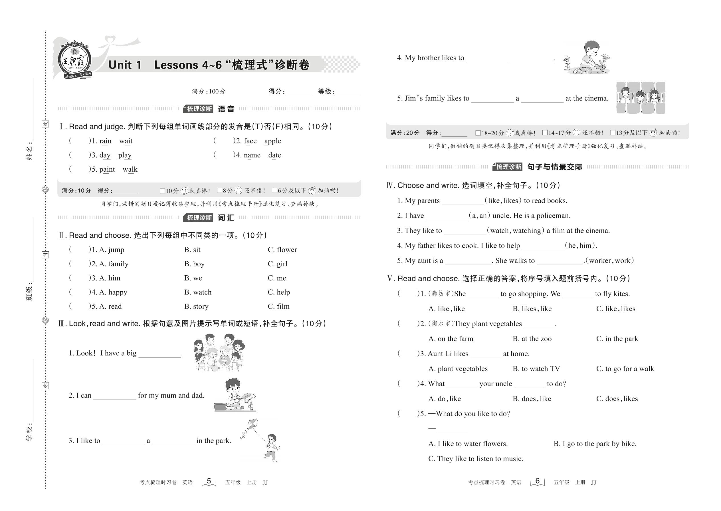 2022上册五年级英语冀教版 Unit 1 Lessons 4~6 “梳理式”诊断卷