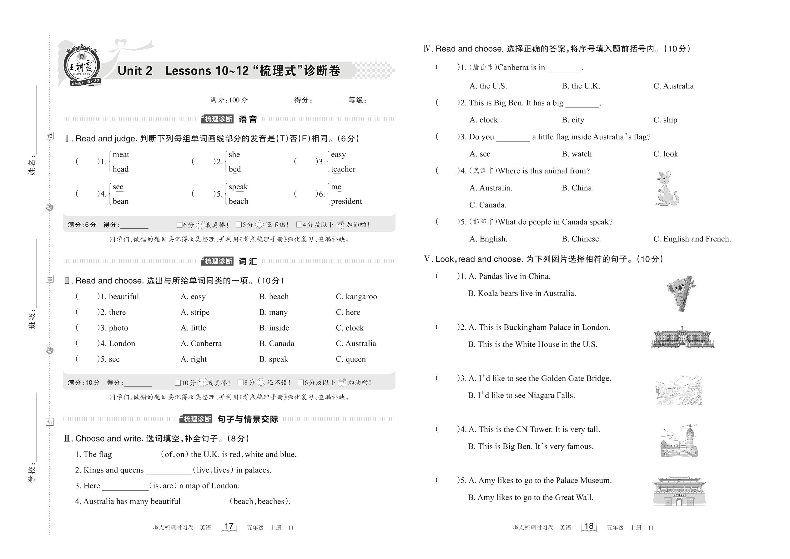 2022上册五年级英语冀教版 Unit 2 Lessons 10~12 “梳理式”诊断卷
