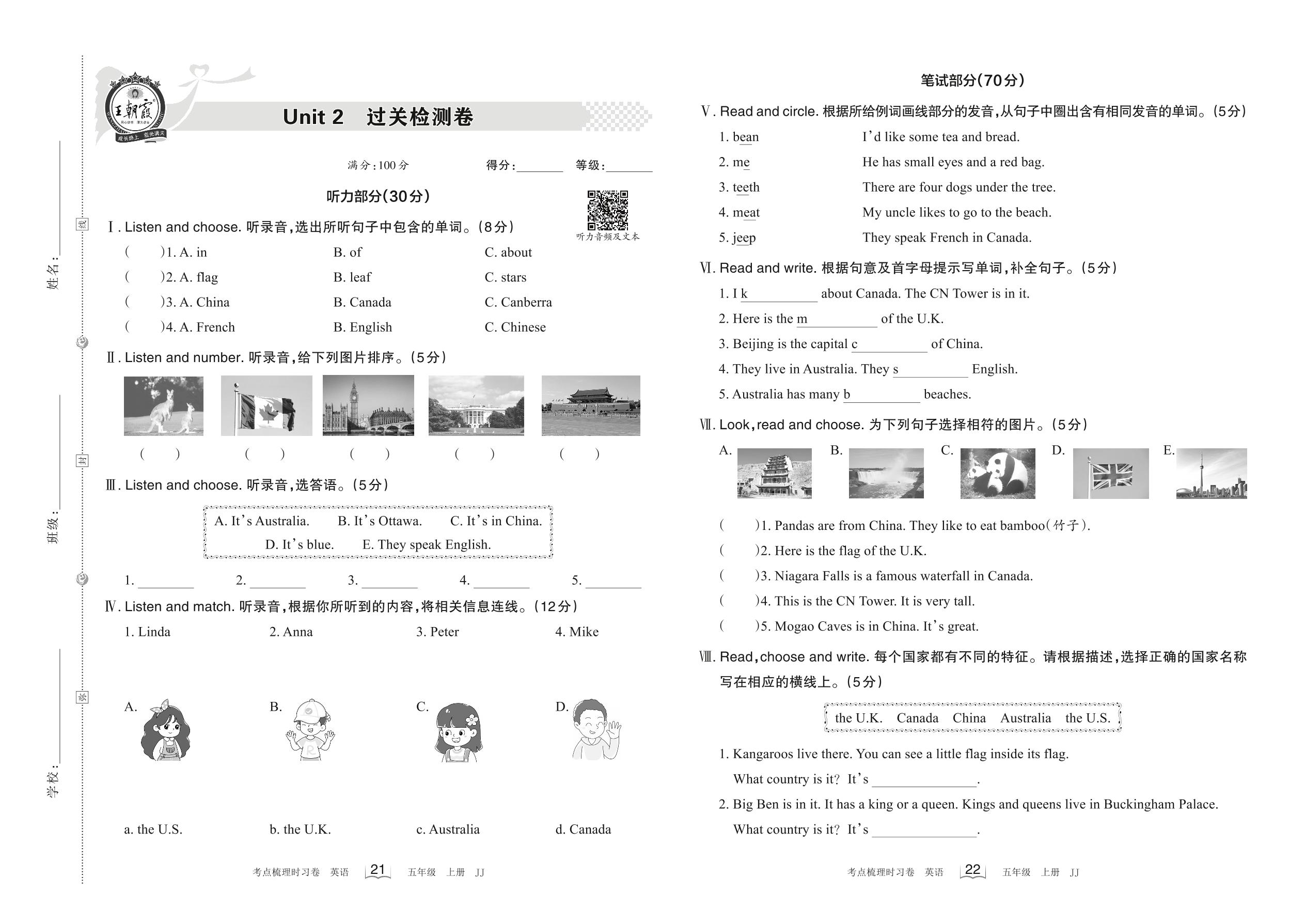 2022上册五年级英语冀教版 Unit 2 过关检测卷