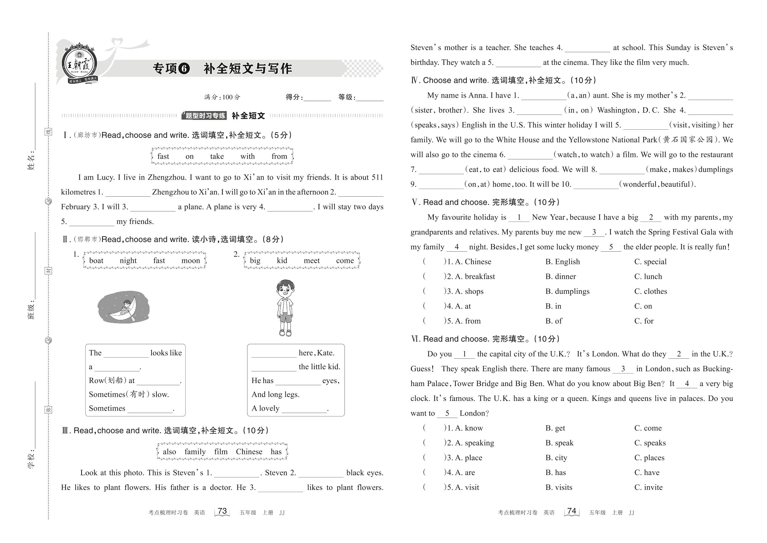 2022上册五年级英语冀教版 专项6 补全短文与写作