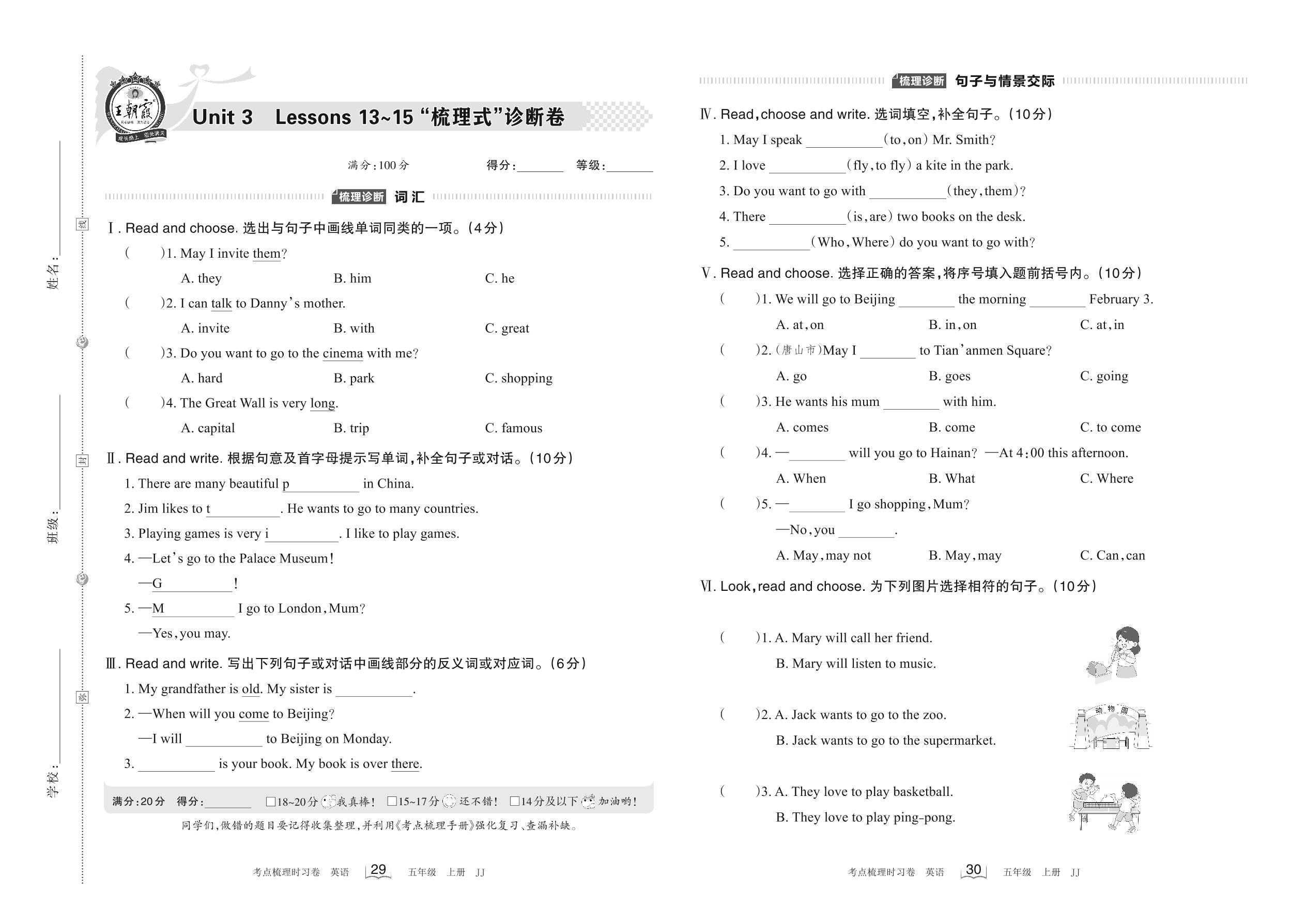 2022上册五年级英语冀教版 Unit 3 Lessons 13~15 “梳理式”诊断卷