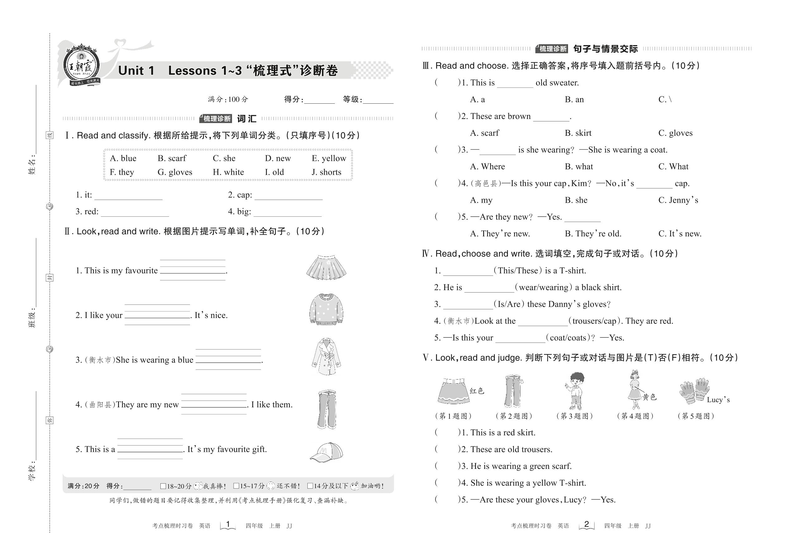 2022上册四年级英语冀教版 Unit 1 Lessons 1~3 “梳理式”诊断卷