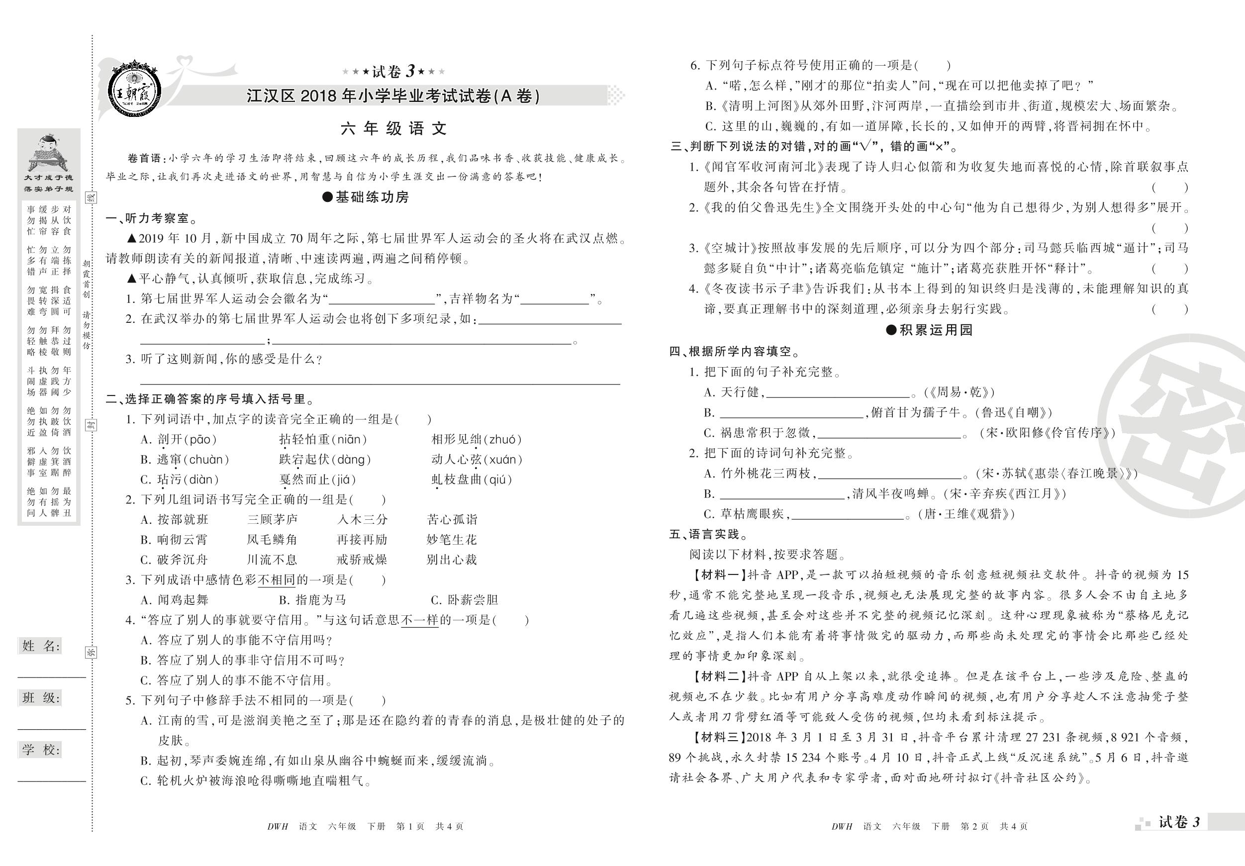 2017-2018学年第二学期武汉市江汉区六年级语文试卷(鄂教版)【3】