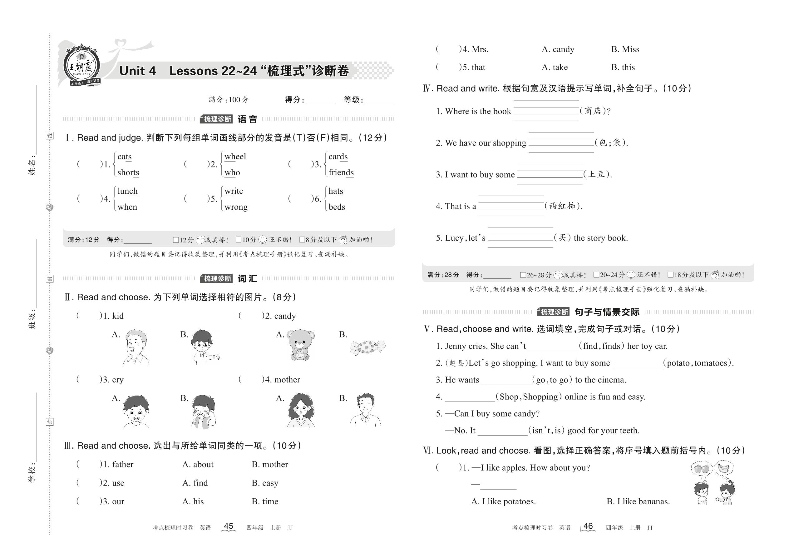 2022上册四年级英语冀教版 Unit 4 Lessons 22~24 “梳理式”诊断卷