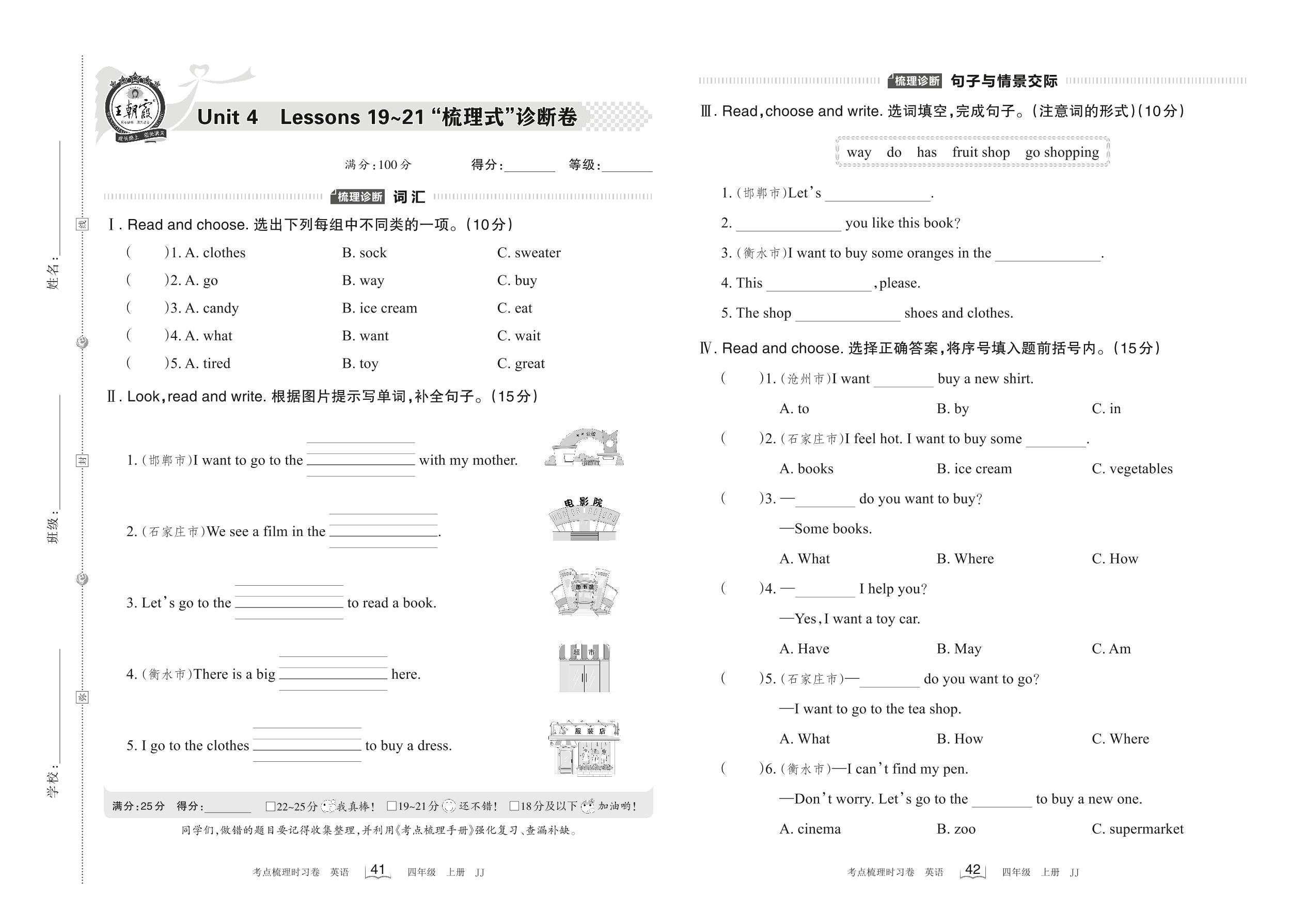 2022上册四年级英语冀教版 Unit 4 Lessons 19~21 “梳理式”诊断卷