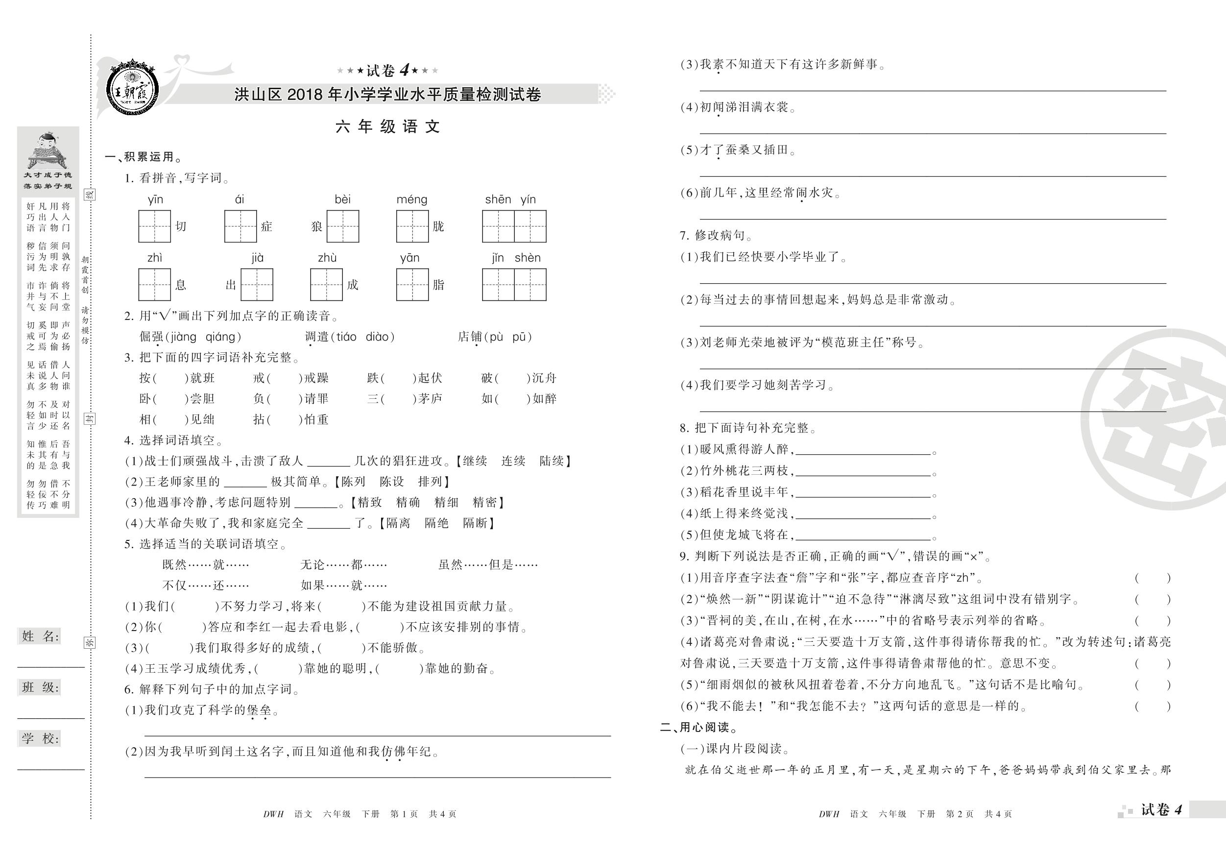 2017-2018学年第二学期武汉市洪山区六年级语文试卷(鄂教版)【4】