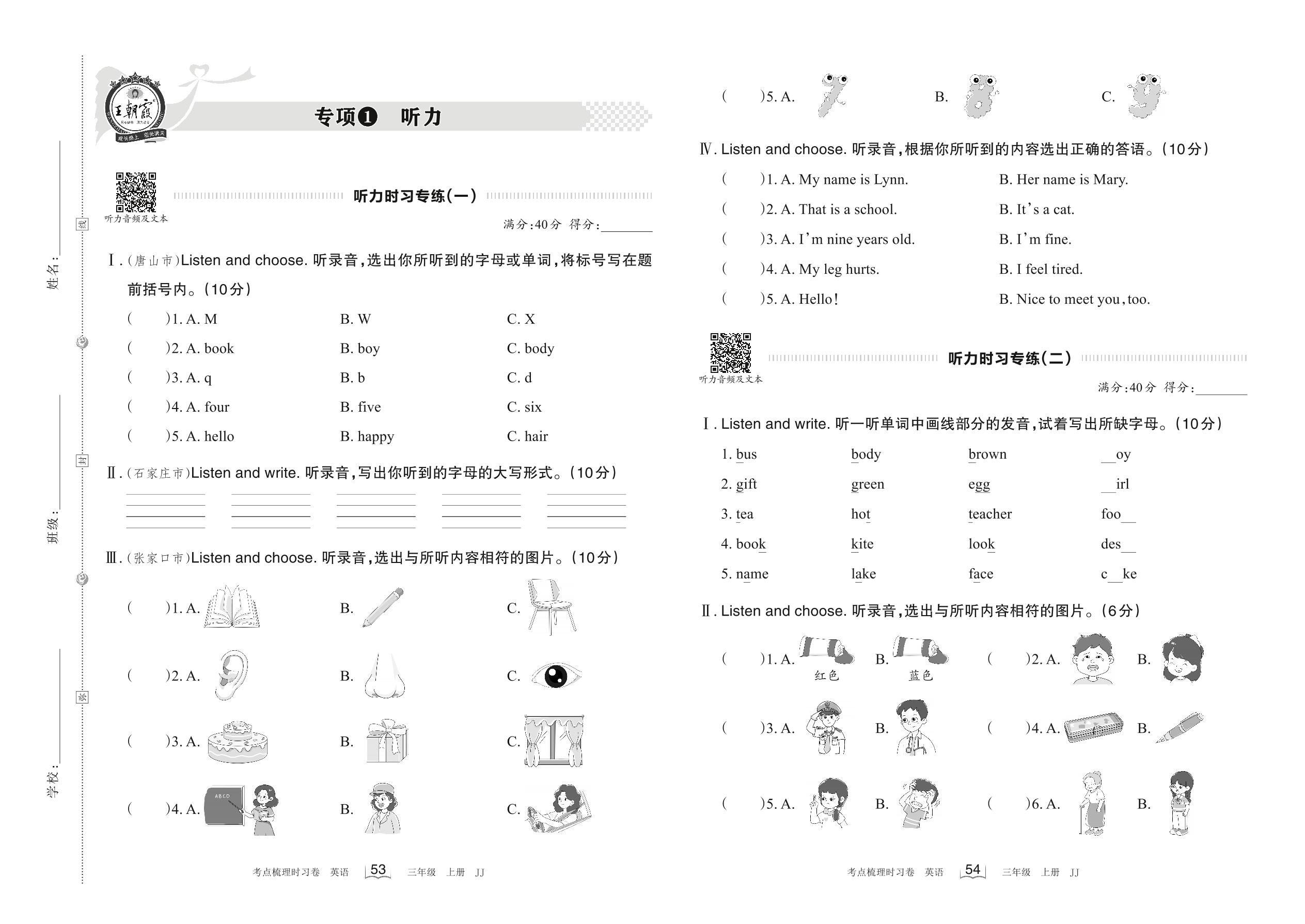 2022上册三年级英语冀教版 专项1 听力
