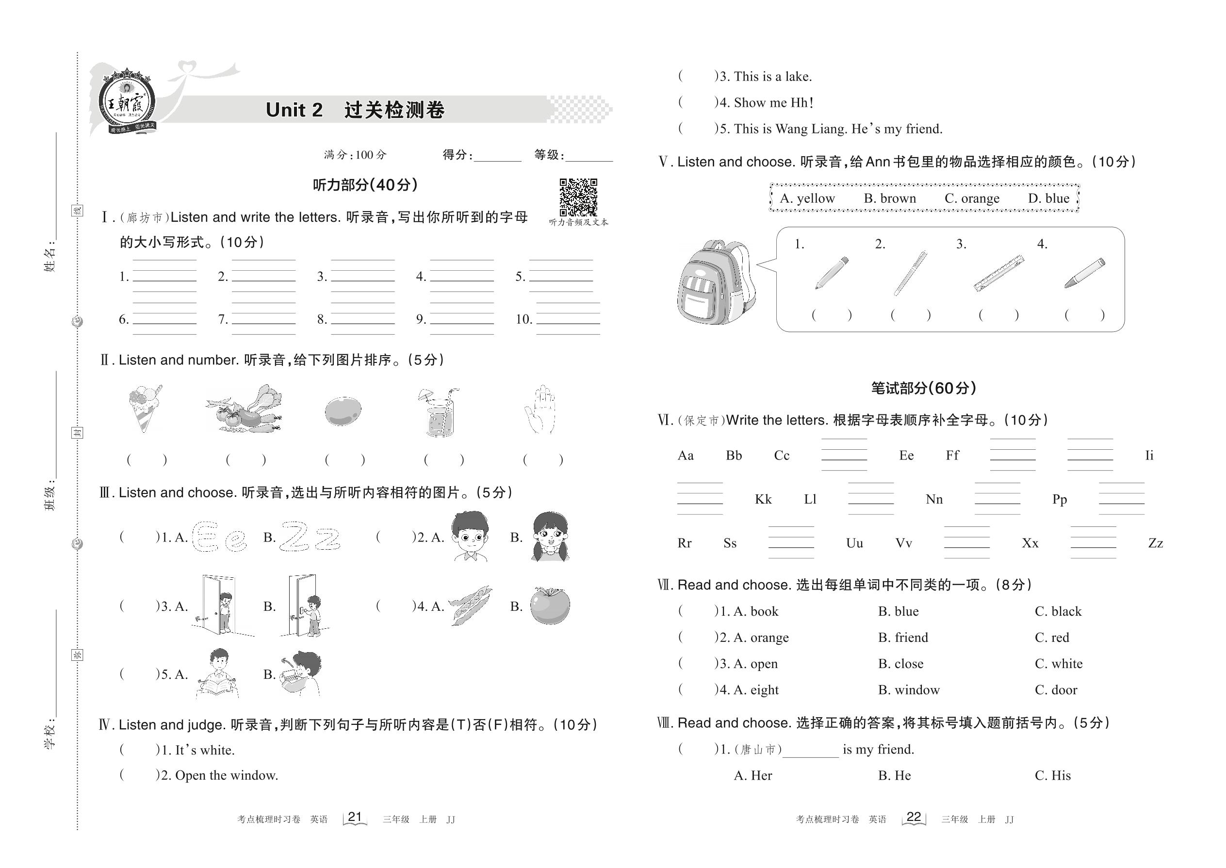 2022上册三年级英语冀教版 Unit 2 过关检测卷