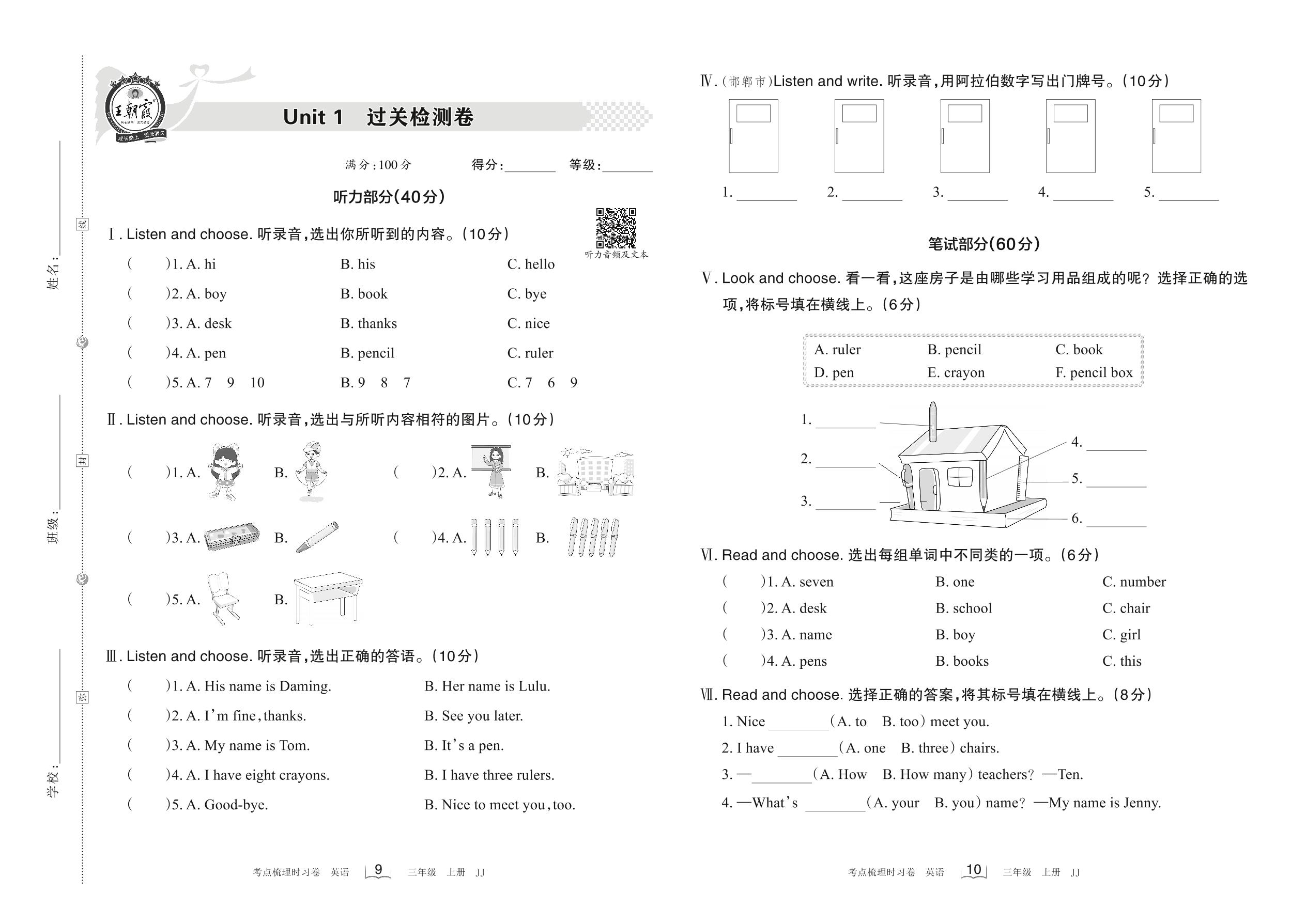 三年级英语冀教版上册单元卷