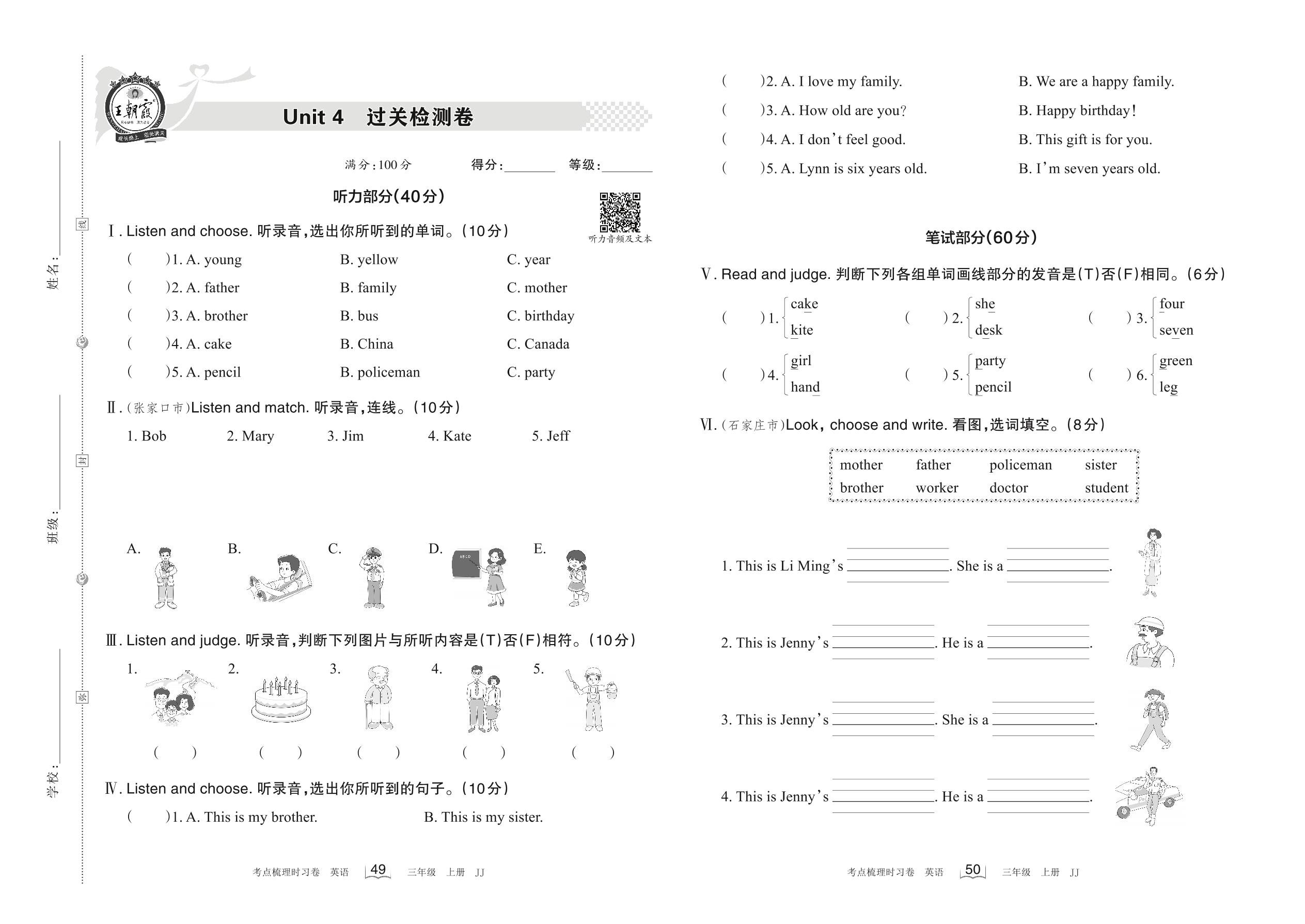 三年级英语冀教版上册单元卷