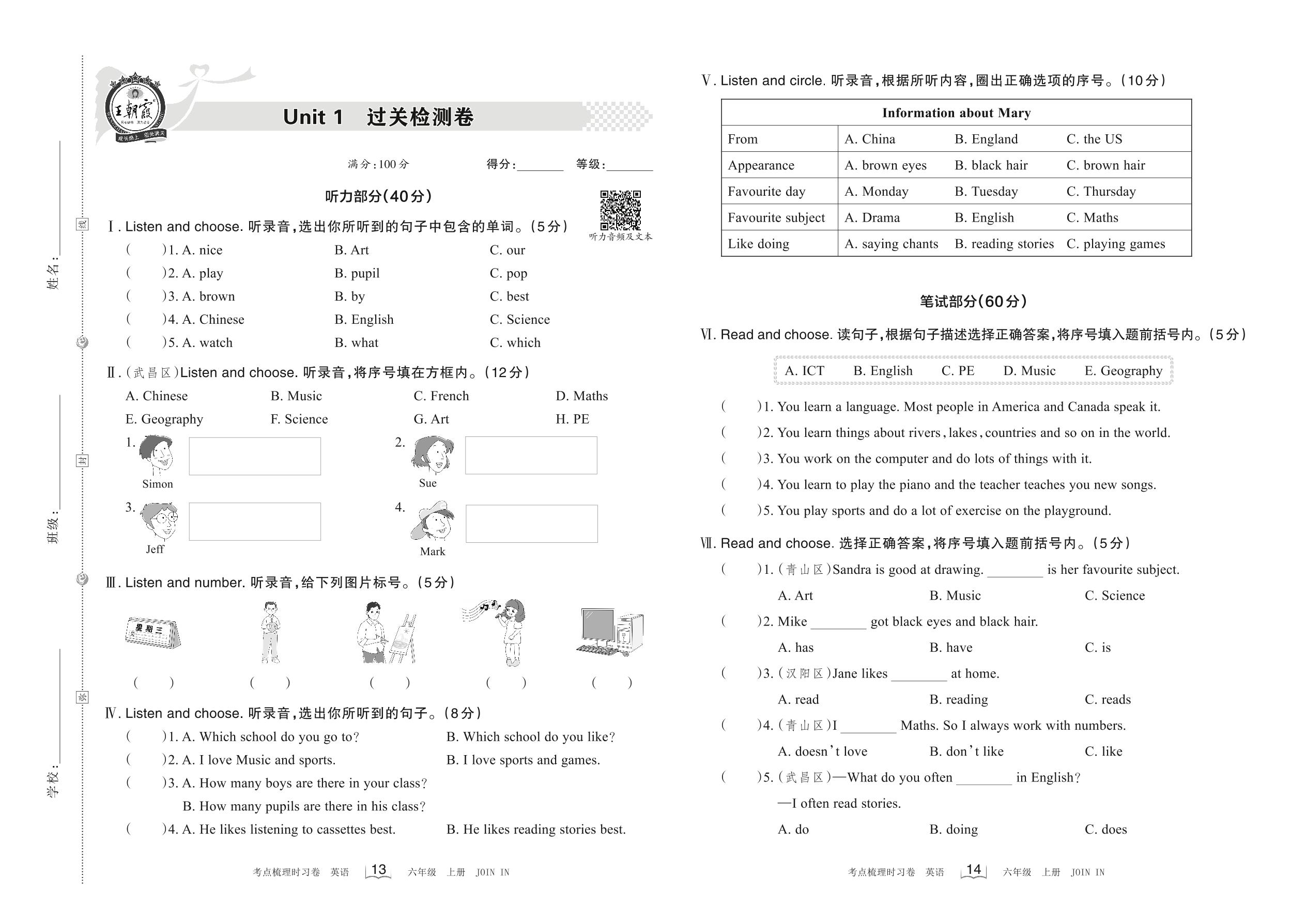 2022上册六年级英语剑桥版 Unit 1 过关检测卷