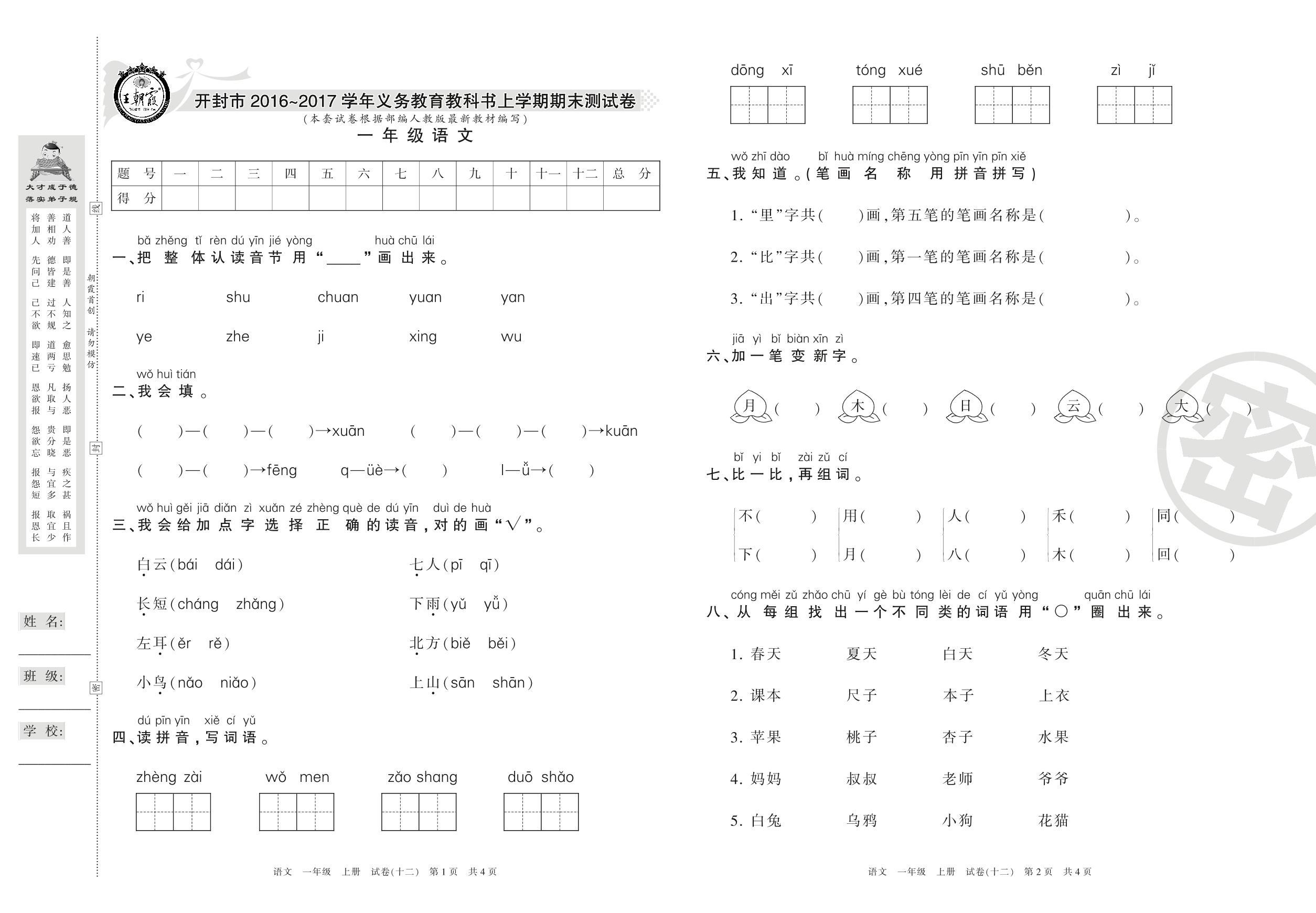 2016-2017学年第一学期开封市一年级语文试卷(人教版)【12】