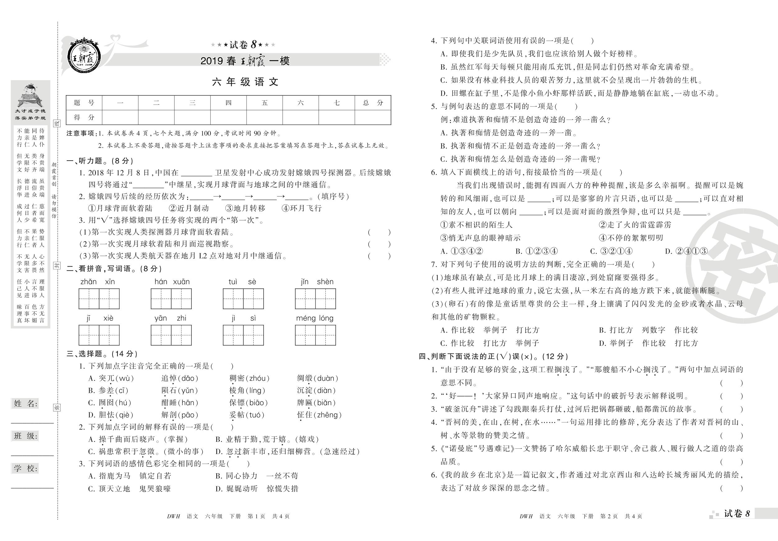 王朝霞期末模拟卷六年级下册语文(鄂教版)【8】